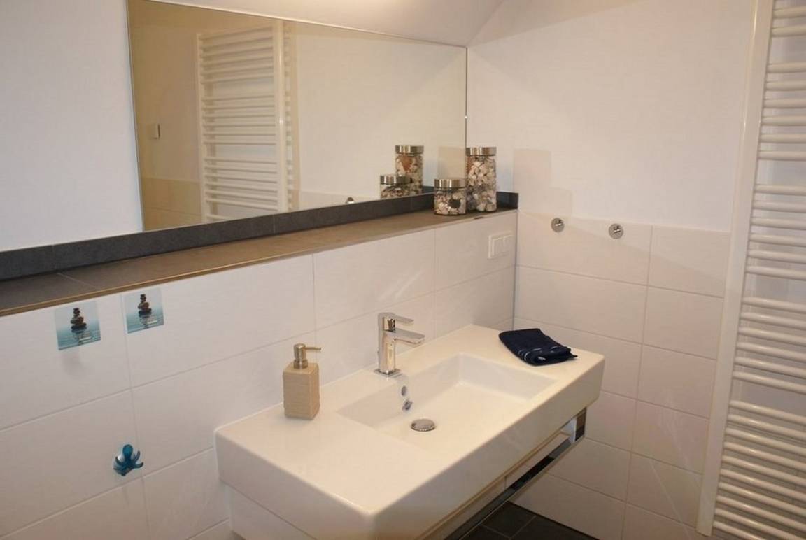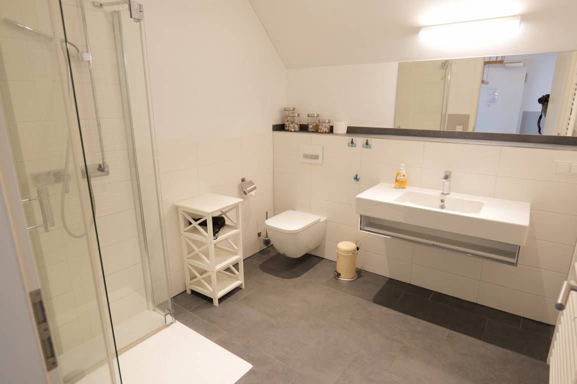 - Badezimmer mit Dusche, WC, großen Spiegelschrank
