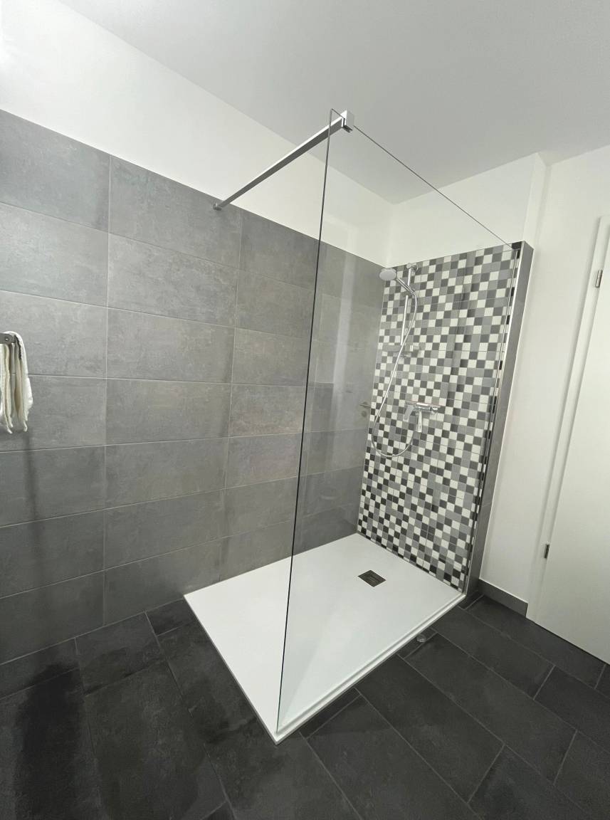 - bodenebene Dusche (90 x 1,20m), WC, Spiegel, Kosmetikspiegel und Ablage
