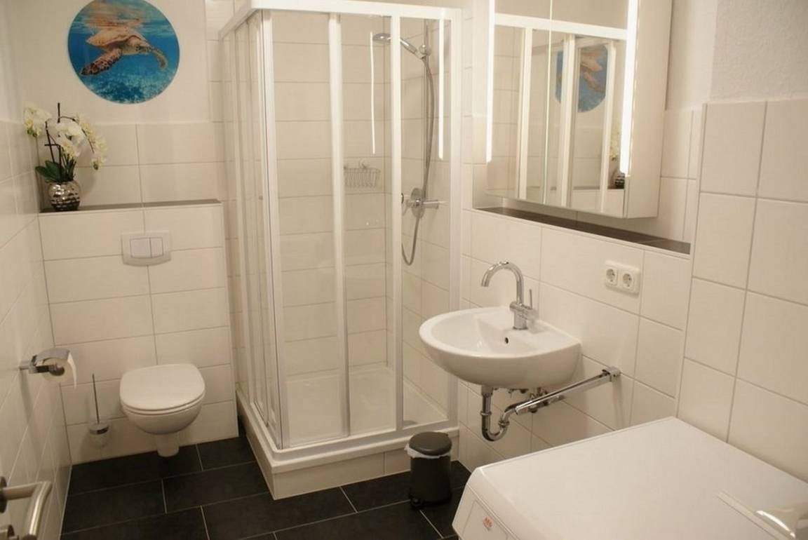 - Badezimmer mit Dusche, WC, Spiegel und Waschmaschine