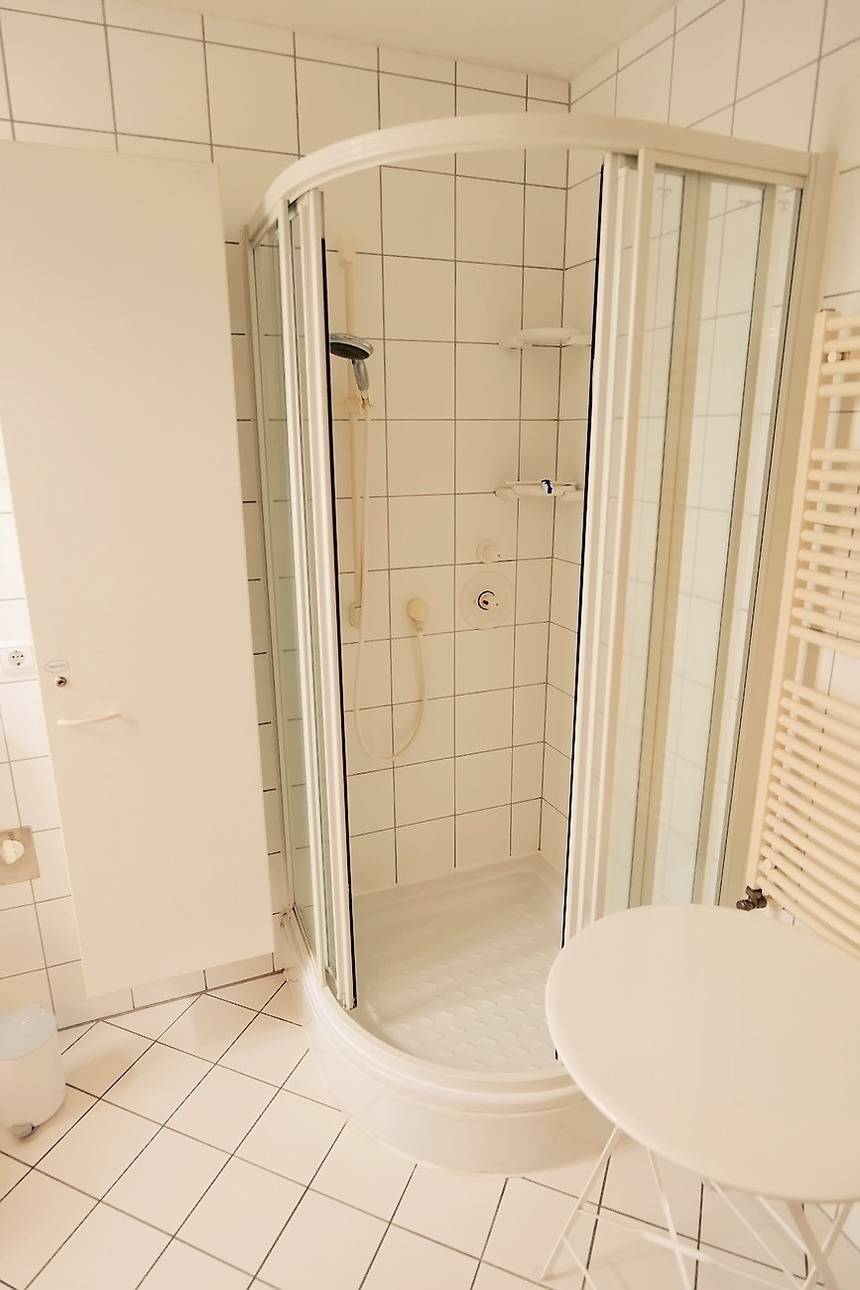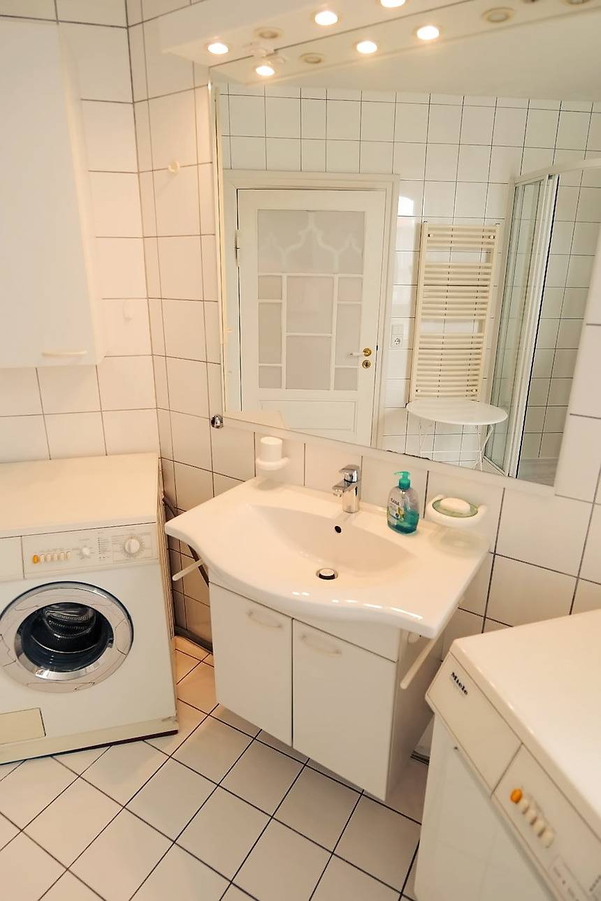 - Badezimmer mit Dusche, WC, Waschmaschine und Trockner, Spiegel und Ablage (Fön)
