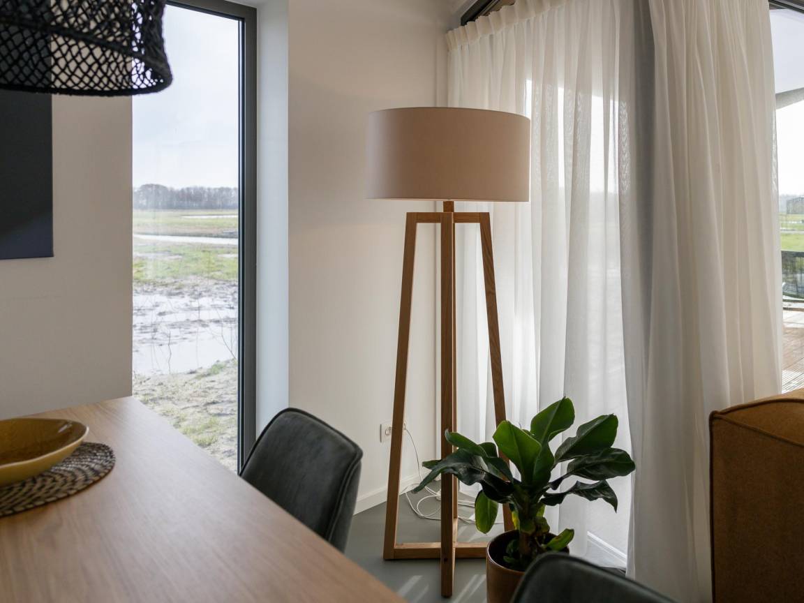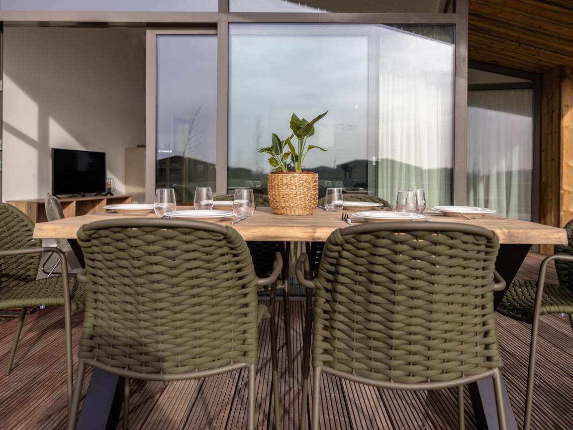 Hausbeschreibung : Freistehendes Naturhaus mit Wohnzimmer und offener Küche und Blick auf den Teich. Verfügt über 3 Schlafzimmer mit zwei Doppelbetten und einem Einzelbett. Badezimmer mit Dusche, Waschbecken und Toilette sowie eine separate Toilette im Flur. Rundherum mehrere Terrassen mit verschiedenen Sitzgelegenheiten