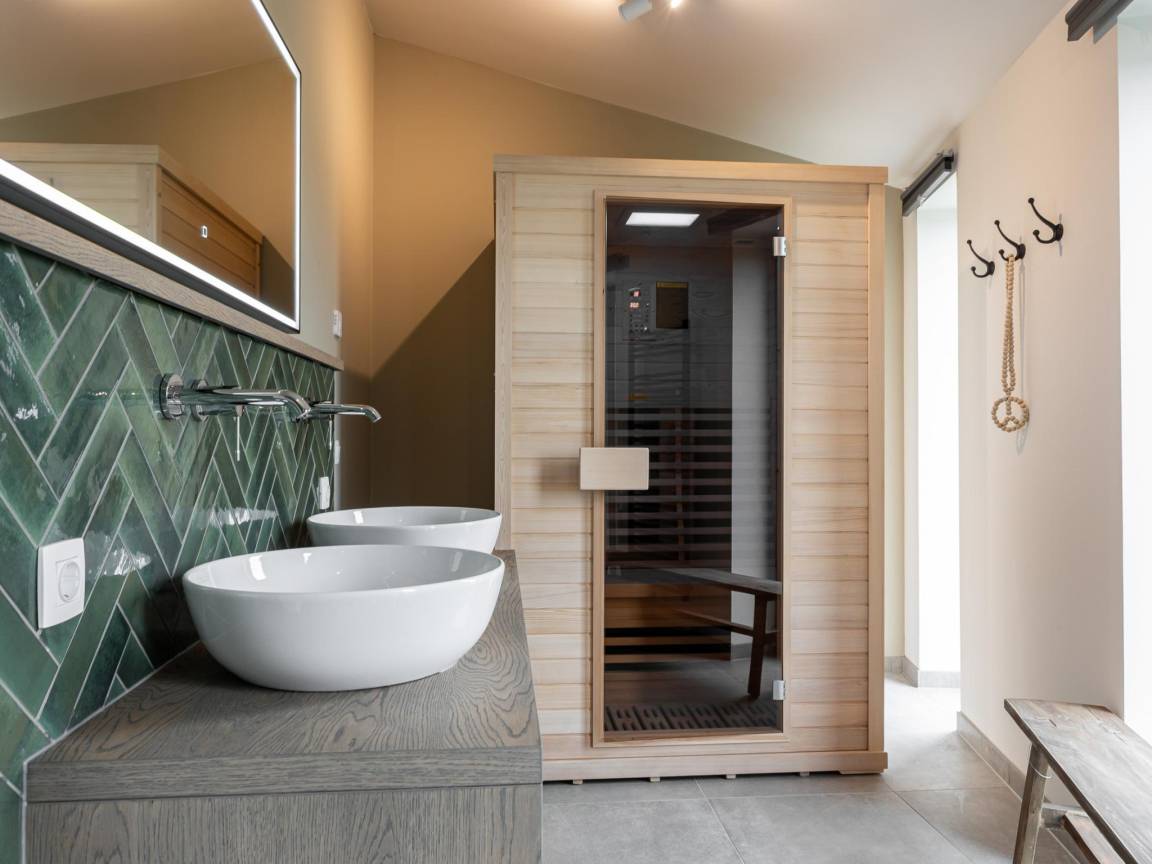 Layout : Parterre(privater Eingang): Wohnzimmer mit TV, Esstisch, Sitzecke , offene Küche mit Kochplatte, Wasserkocher, Kaffeemaschine(nespresso cups), Kombi-Mikrowelle, Geschirrspüler, Kühlschrank , Schlafzimmer mit Doppelbett , Schlafzimmer mit Doppelbett, Waschbecken , Badezimmer mit Dusche, Infrarotsauna, 2x Waschbecken , Toilette mit Toilette