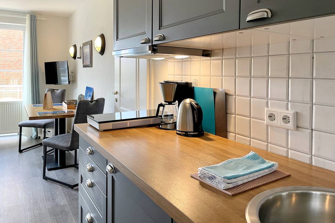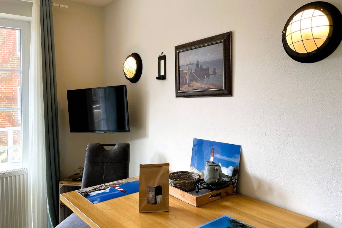 Herzlich Willkommen auf Amrum und in unserer gemütlichen Ferienunterkunft Huus Waterkant 02. Diese liebevoll gestaltete Unterkunft bietet Ihnen genau den richtigen Rahmen für einen erholsamen und entspannten Urlaub. Im Mittelpunkt steht das einladende Wohn-/Schlafzimmer mit einem komfortablen Doppelbett für zwei Personen, das Ihnen erholsame Nächte garantiert. Ein geräumiger Schrank sorgt für ausreichend Stauraum, während die integrierte Küchenzeile kleine kulinarische Verwöhn-Momente ermöglicht. Der praktische Esstisch mit Stühlen lädt zum gemeinsamen Essen oder geselligen Spieleabenden ein.
