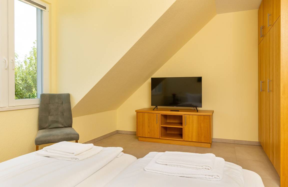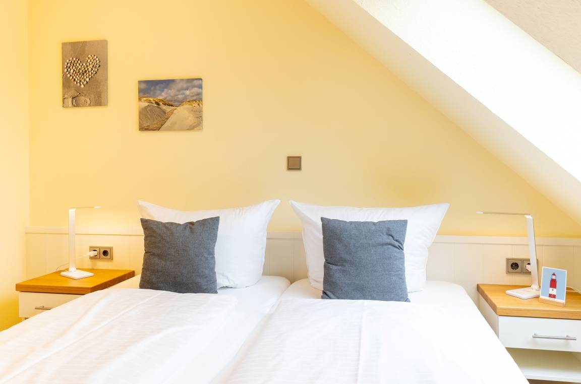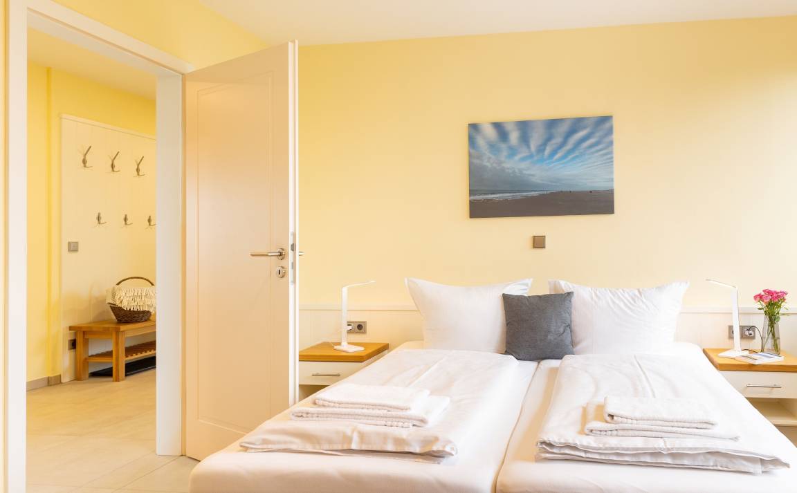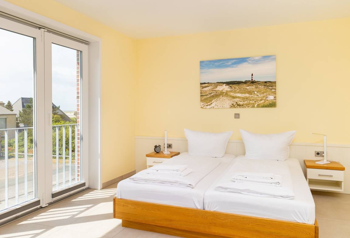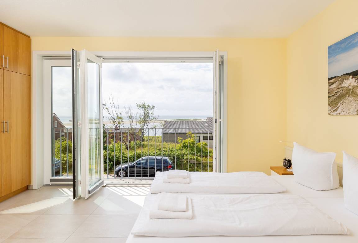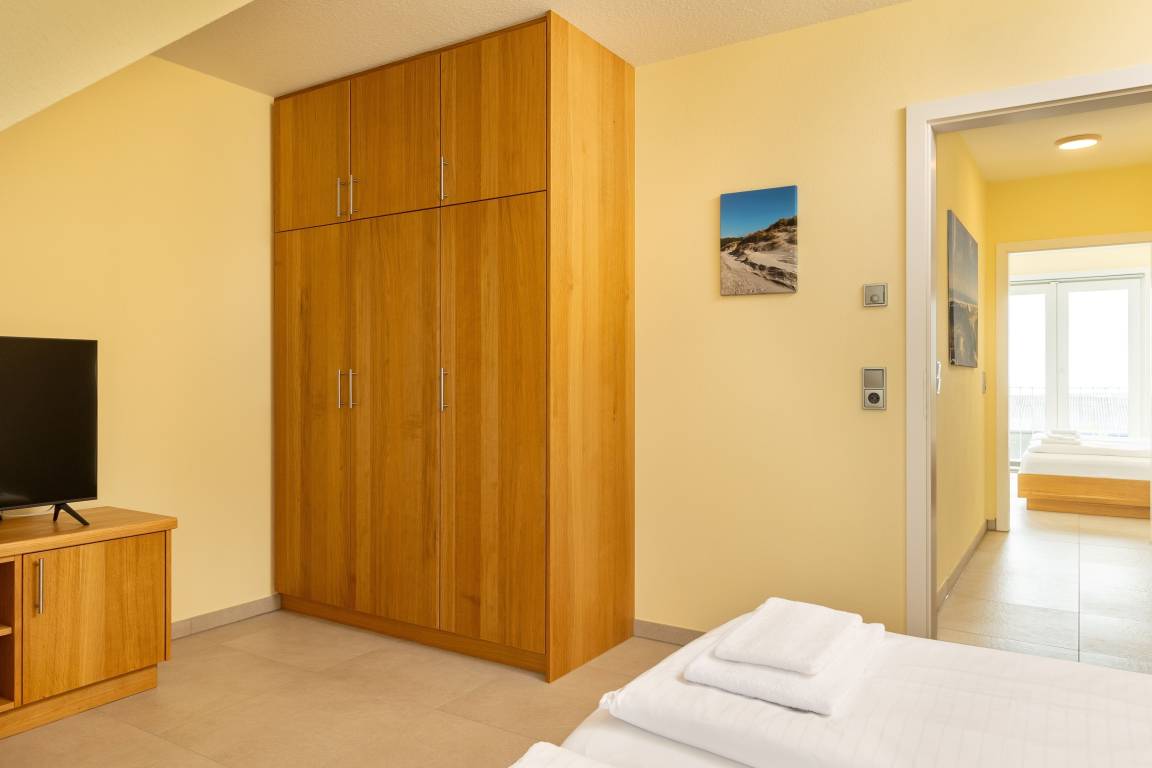 Drei Schlafzimmer mit Doppelbett, eigenem TV und geräumige Einbauschränke werden jeweils mit Meerblick über Wittdün abgerundet.