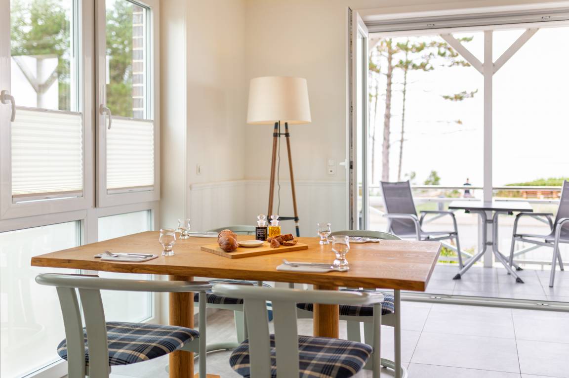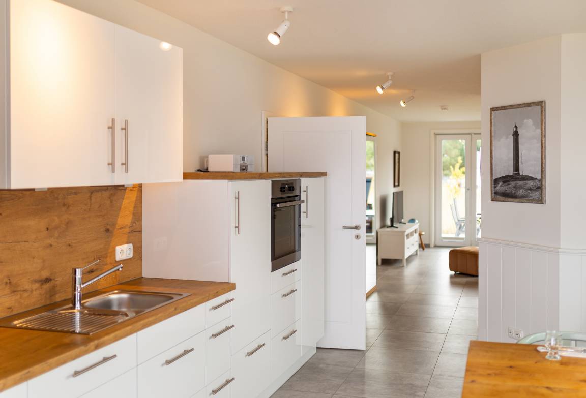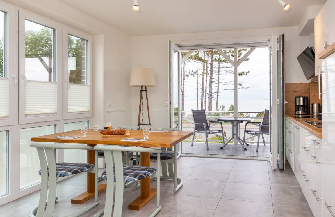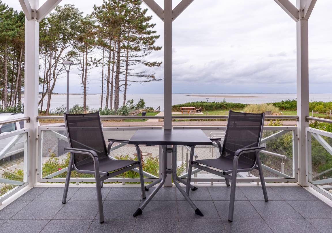 Die Küche mit Essbereich und eigenem Balkon bietet einen herrlichen Blick auf das Wattenmeer und die Gezeiten. Bis nach Steenodde, Norddorf und sogar zu der Nachbarinsel Föhr reicht die unvergessliche Sicht.