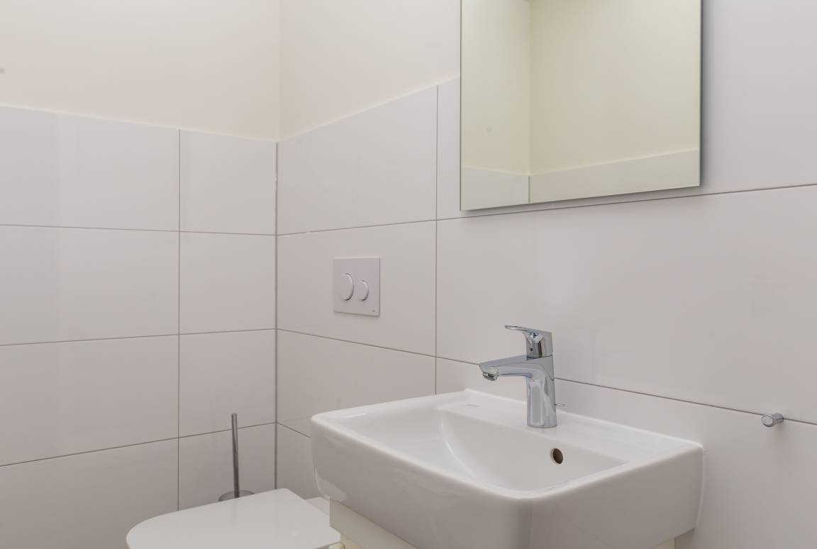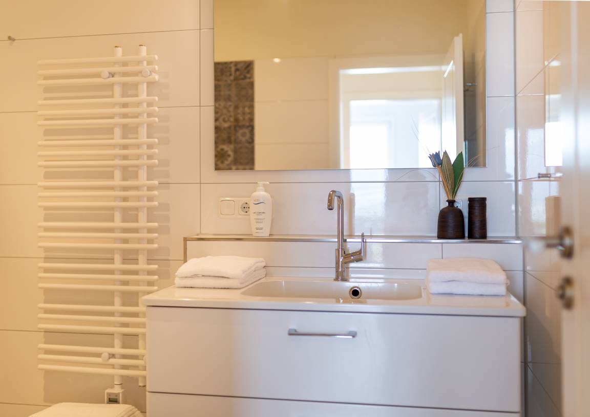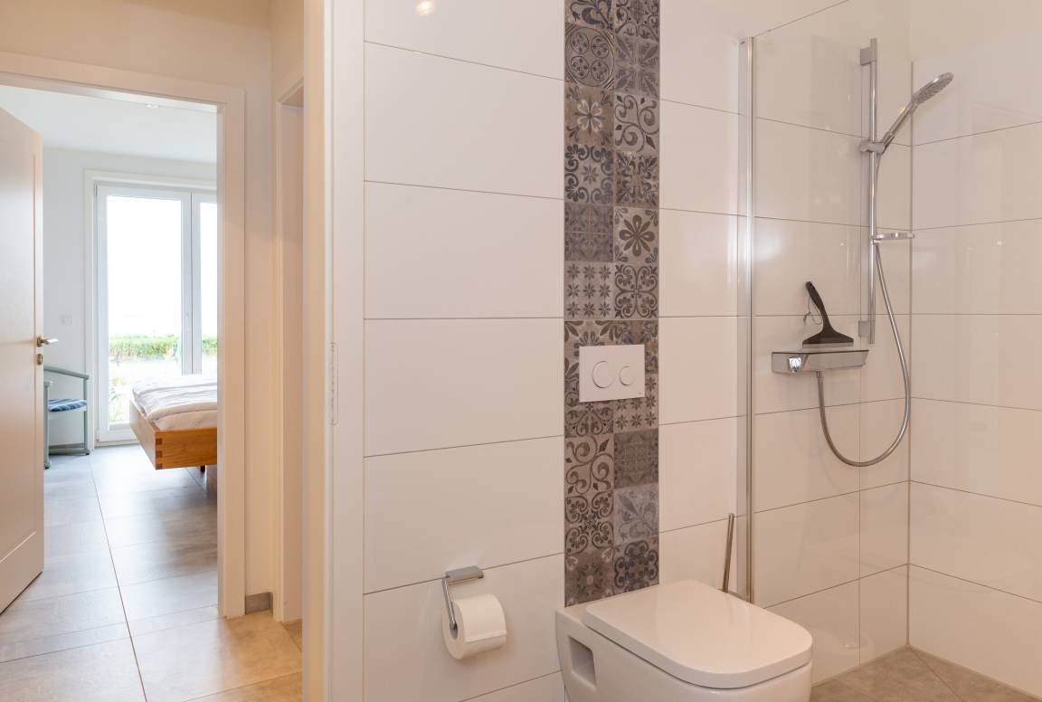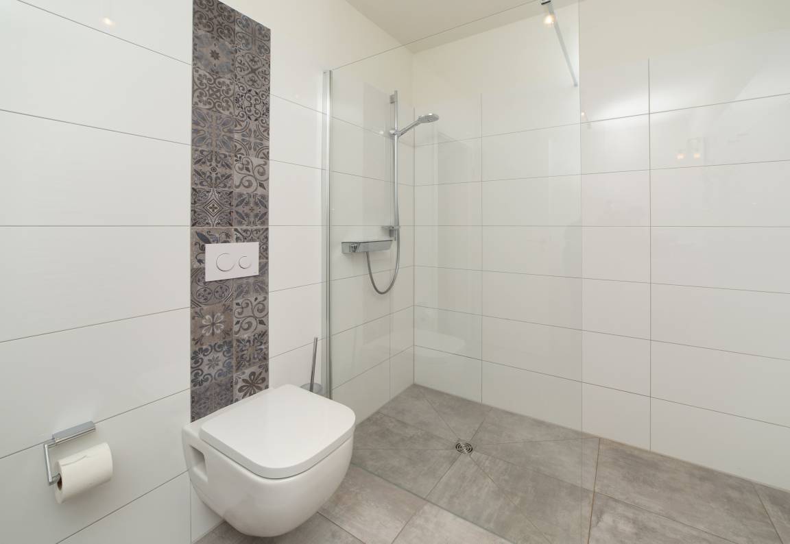 Zudem erwartet sie ein modernes Badezimmer mit ebenerdiger Dusche und WC sowie ein separates Gäste-WC.