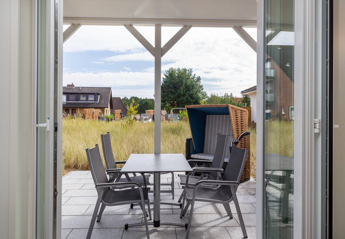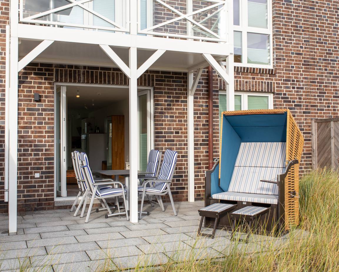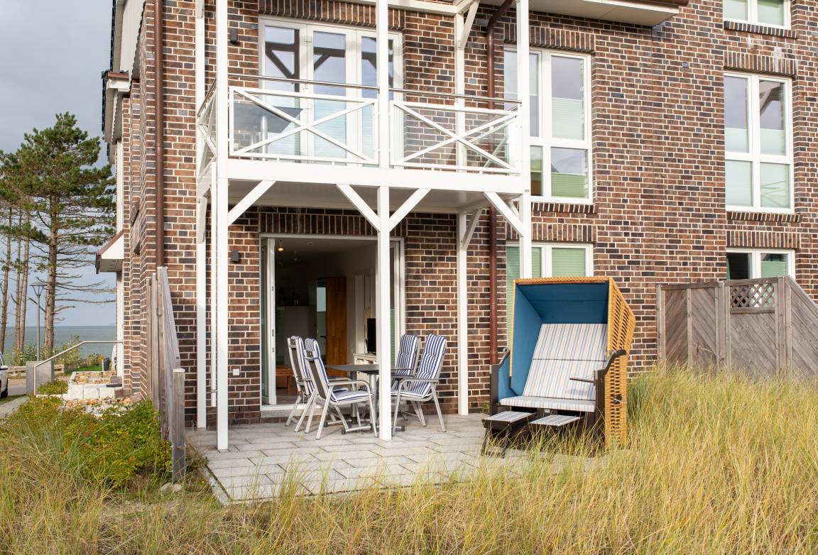 Eine nach Süden ausgerichtete Terrasse ist direkt vom Wohnzimmer aus zu erreichen. Dort finden Sie einen Strandkorb und Gartenmöbel vor. Zudem steht Ihnen auf der nördlichen Seite der Ferienwohnung an der Inselstraße ebenfalls ein Balkon mit Meerblick zur Verfügung.