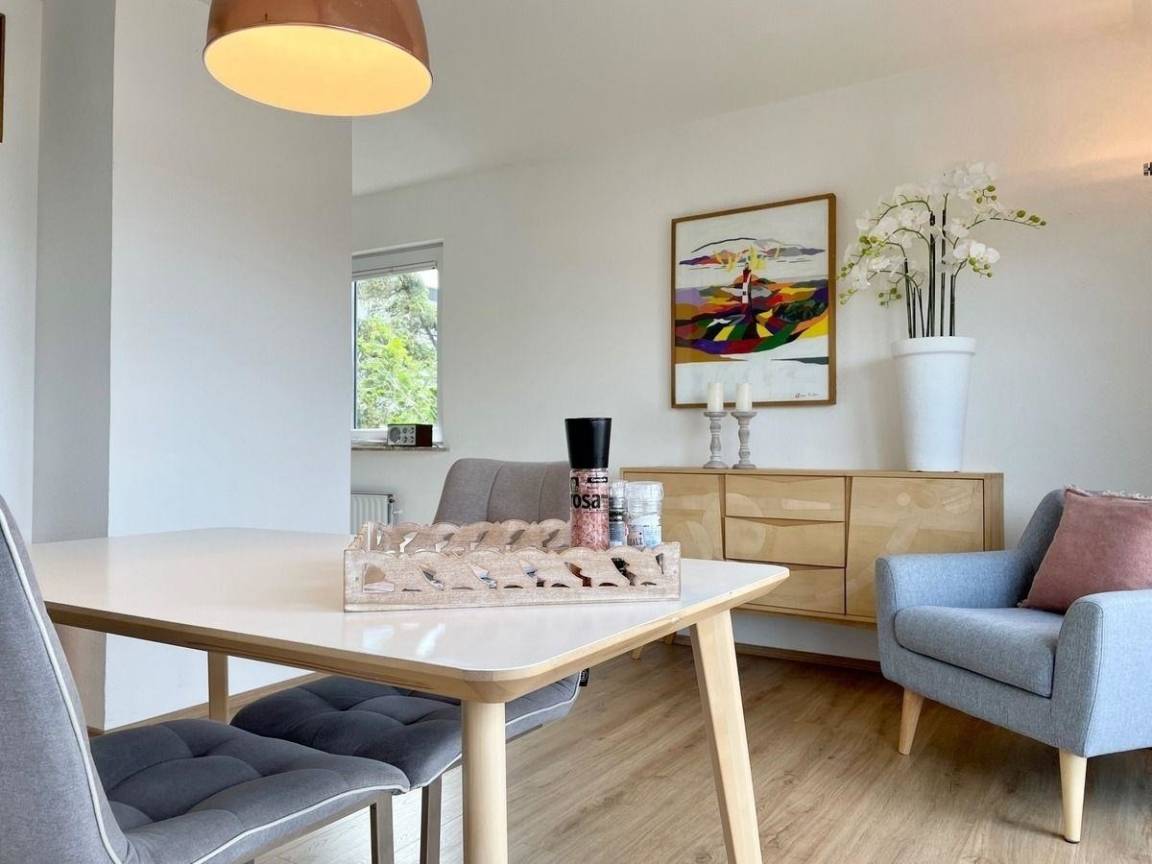 Die zentrale Lage erlaubt ein unkompliziertes Erreichen aller wesentlichen Annehmlichkeiten, darunter Einkaufsmöglichkeiten und Restaurants, die sich fußläufig befinden. Trotz der Nähe zum Ortskern ist die Wohnung von jeglichem Autolärm abgeschottet und bietet somit eine wohltuende Ruhe. Für PKWs steht ein Stellplatz direkt vor dem Wohnhaus zur Verfügung, während das kostenfreie WLAN im Außenbereich in ortsüblicher Geschwindigkeit verfügbar ist. Haustiere sind nicht erlaubt.