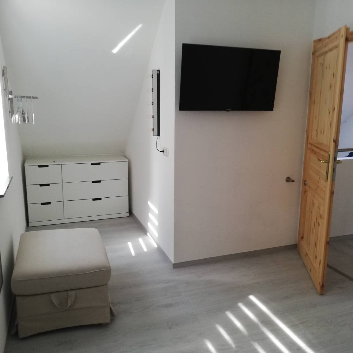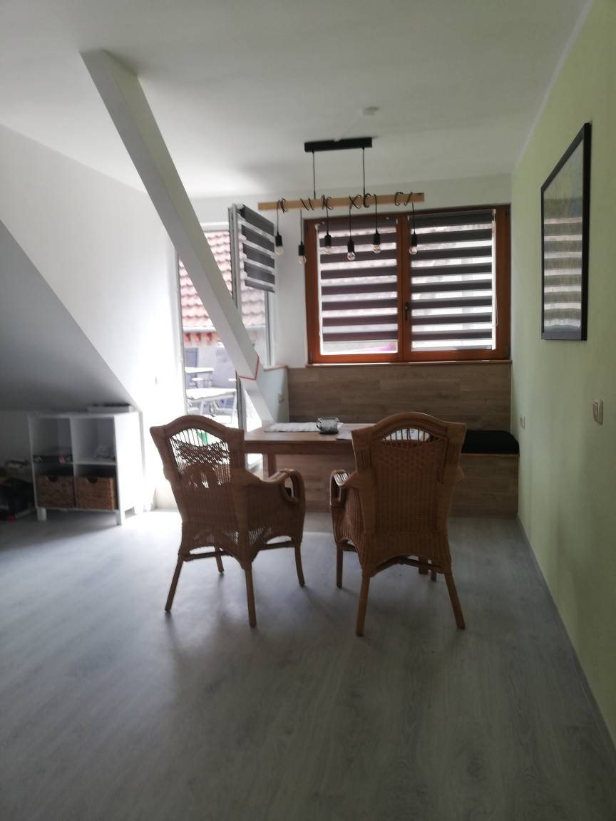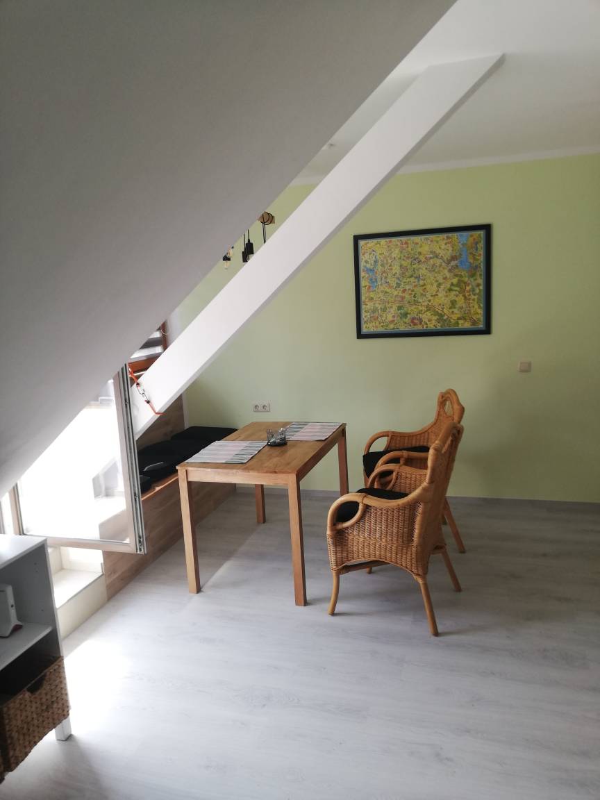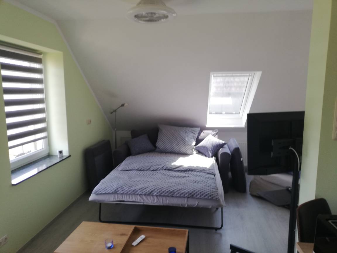 Sehr ruhige, mitten im Dorf liegende Ferienwohnung zu vermieten. Die Wohnung mit einem separaten Schlafzimmer (1,40m Doppelbett) und einer ausziehbaren Schlafcouch (1,40m) im Wohnbereich ist für 3 Personen geeignet . Wohnzimmer/Küche (mit Tresen) und einer Essecke bilden ein großen L . Modernes Badezimmer mit Fußbodenheizung und Dusche. Sat TV (im Wohnzimmer auf Ständer beweglich, im Schlafzimmer Wandmontage) und kostenfreies WLAN sind vorhanden. Die Küche ist ausgestattet mit Kühlschrank, Geschirrspüler, Kaffeemaschine, Herd, Backofen, Mikrowelle, Toaster. Eine eigene Waschmaschine steht im Aufgangsbereich zur Verfügung und auf der sehr großen Dachterrasse (45 qm) kann man sich entspannen und grillen.