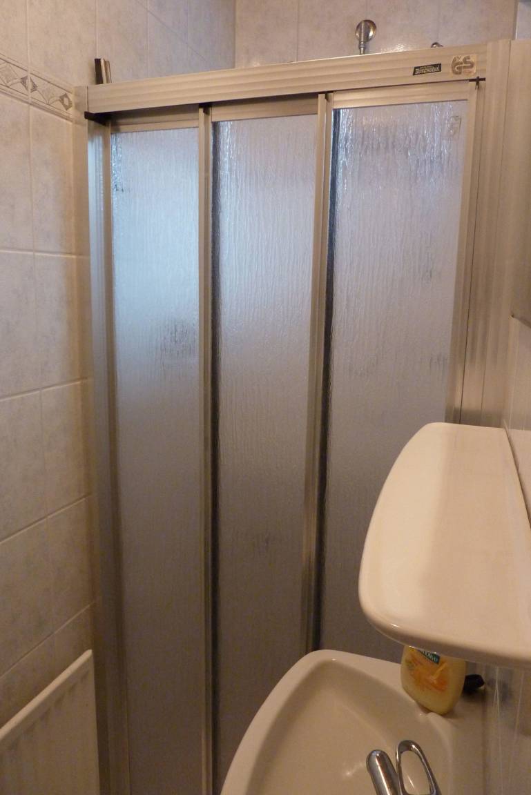 Das kleine Badezimmer verfügt über eine Dusche und einem Fenster.