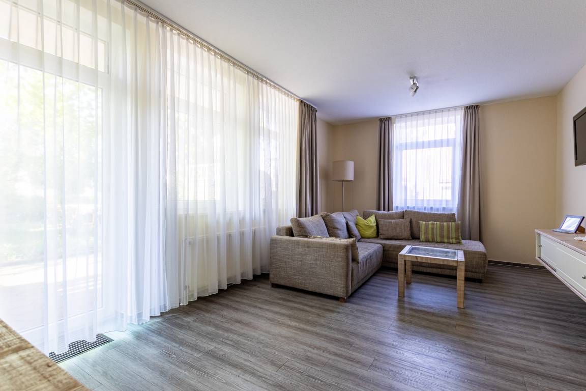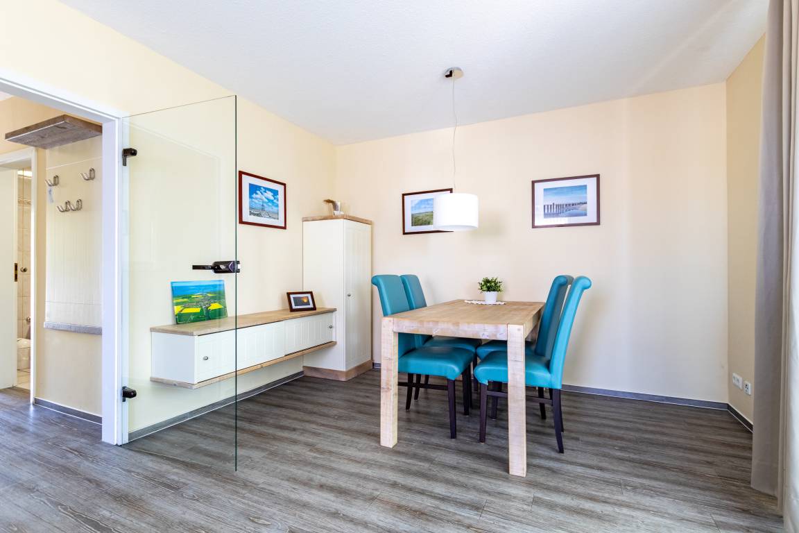 Der offene Wohn- und Essbereich bildet das Herzstück der Wohnung. Eine bequeme Sitzgruppe lädt zum Entspannen ein, während ein moderner HDTV-Flachbildschirm für Unterhaltung sorgt. Der angrenzende Essbereich bietet ausreichend Platz für gemeinsame Mahlzeiten oder ein entspanntes Frühstück.