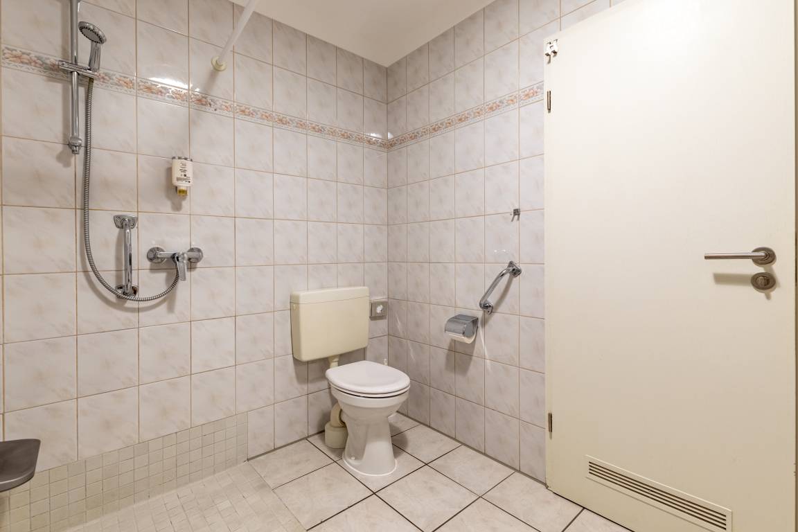 Das Bad verfügt über eine bodengleiche Dusche, WC, einen großzügigen Waschtisch sowie einen Föhn. Die barrierearme Gestaltung der Wohnung ermöglicht auch Gästen mit eingeschränkter Mobilität einen angenehmen Aufenthalt. Für zusätzlichen Stauraum steht ein praktischer Abstellbereich innerhalb der Wohnung zur Verfügung.