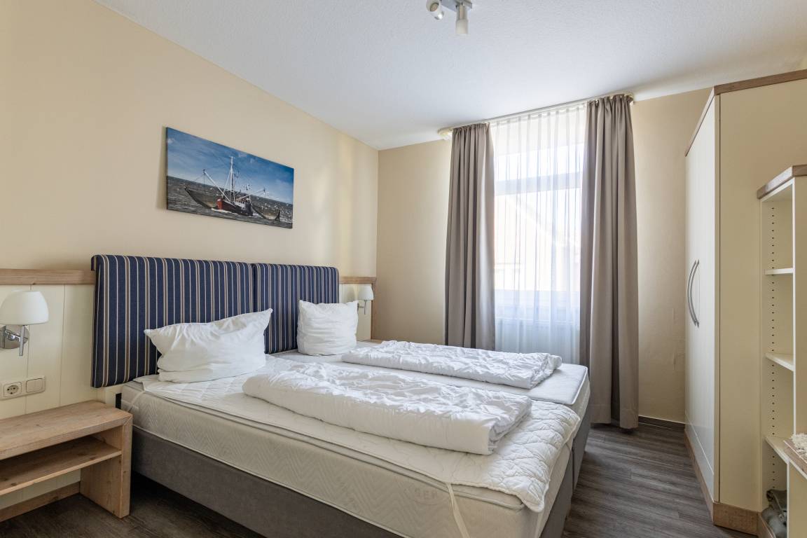Die helle und freundlich gestaltete Wohnung verfügt über eine durchdachte Raumaufteilung und bietet viel Komfort für einen entspannten Aufenthalt. Das separate Schlafzimmer ist gemütlich eingerichtet und sorgt mit komfortablen Betten für erholsame Nächte. Ein großzügiger Kleiderschrank sowie praktische Ablagemöglichkeiten bieten ausreichend Platz für Ihre persönlichen Dinge.