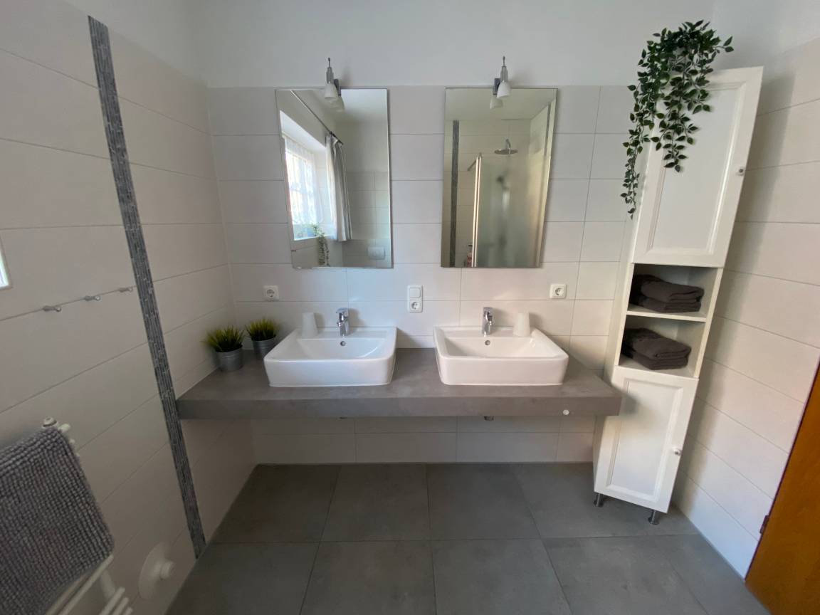 Bad mit Tropenregendusche (barrierefrei), 2 Waschtische und WC