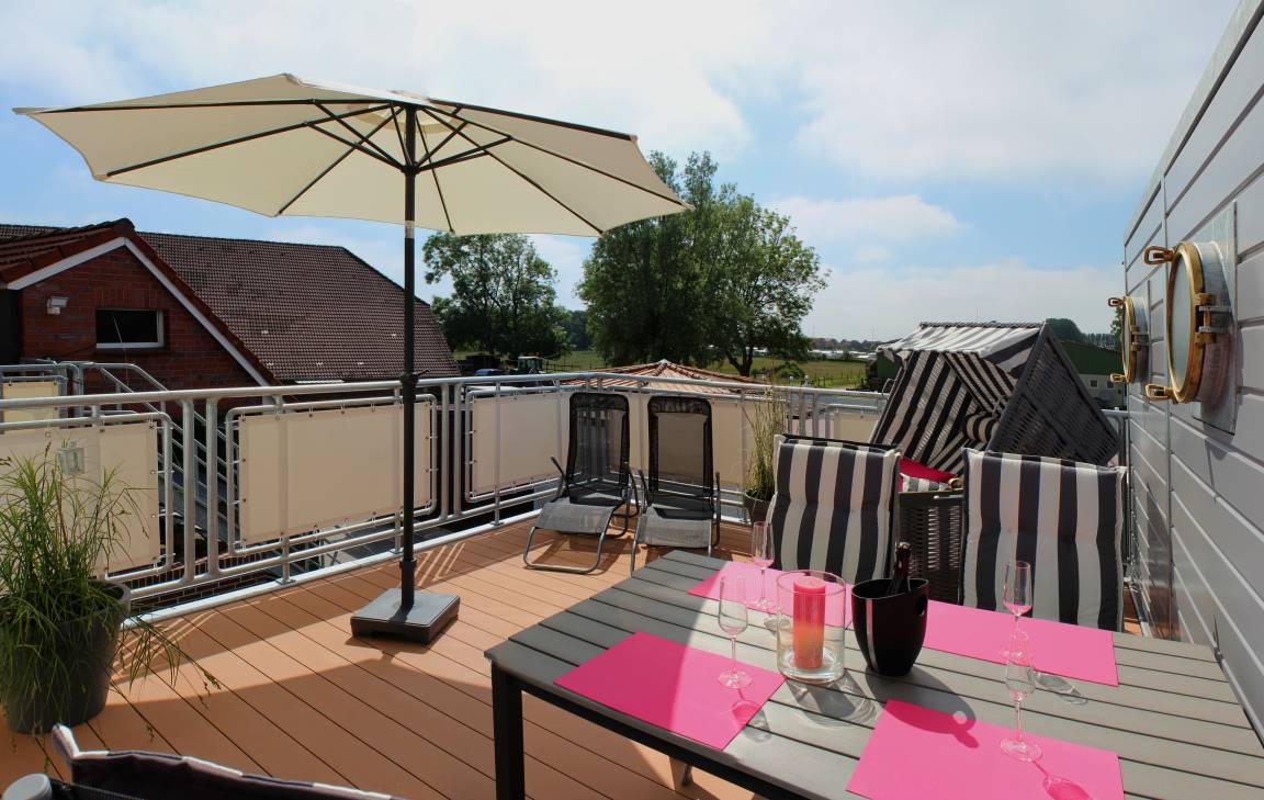 Von der Küche aus gelangen Sie auf die großzügige Terrasse des Kapitänshaus. Ganz gleich ob Sie hier frühstücken, ein Sonnenbad auf der Liege genießen, oder bei einem Glas Wein den Sonnenuntergang vom Strandkorb aus beobachten. Hier finden Sie einen Ort, um einfach mal die Seele baumeln zu lassen.