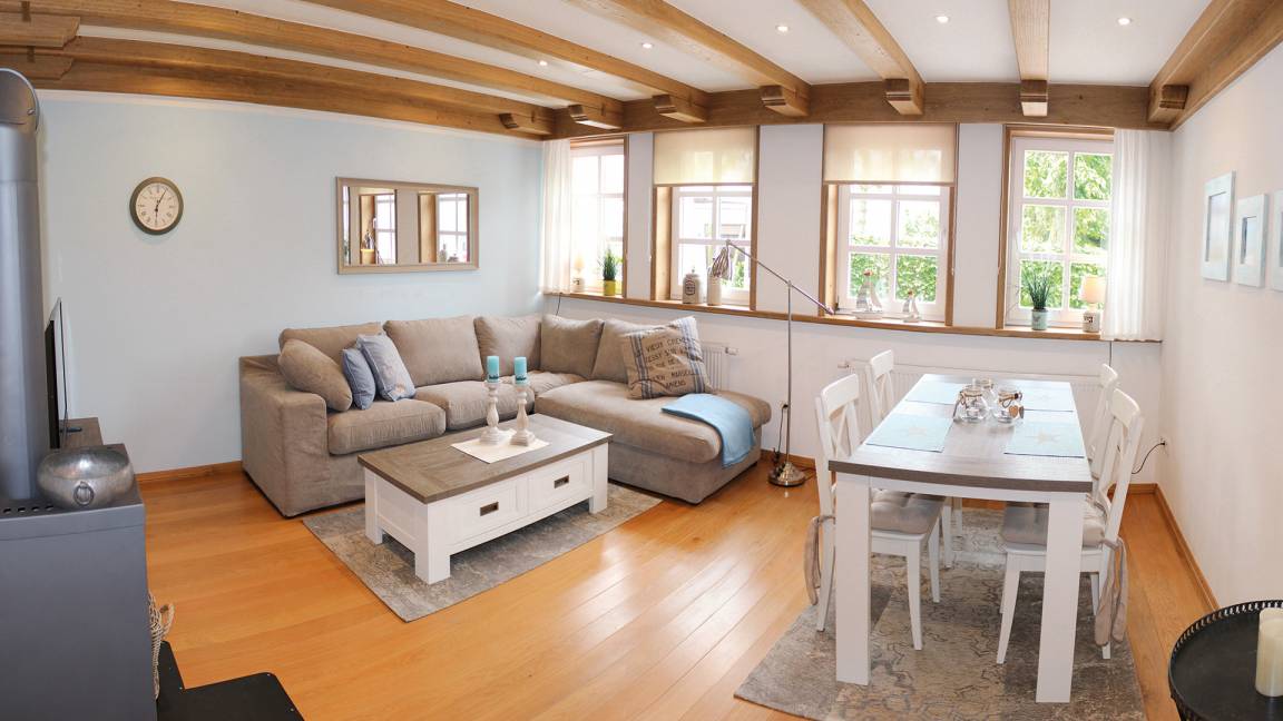 Der Wohnbereich ist mit Echtholzparkett ausgestattet und verfügt über eine gemütliche Couchecke mit Flachbild TV, weiße Landhausmöbel, einen Essbereich für 4 Personen und einen freistehenden Kamin.