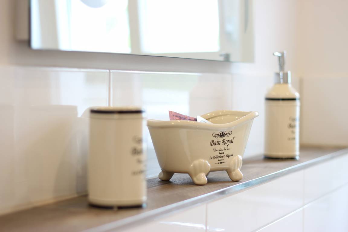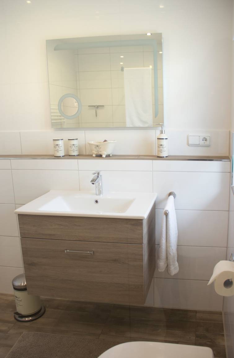 Sowohl im EG als auch im UG finden Sie modernste Wellnessbäder mit hochwertiger Ausstattung und Tageslicht: Ebenerdige Regenduschen, Handtuch- und Fußbodenheizung, sowie einer Infrarotsauna für wohltuende Wärme nach einem Tag am Meer.
