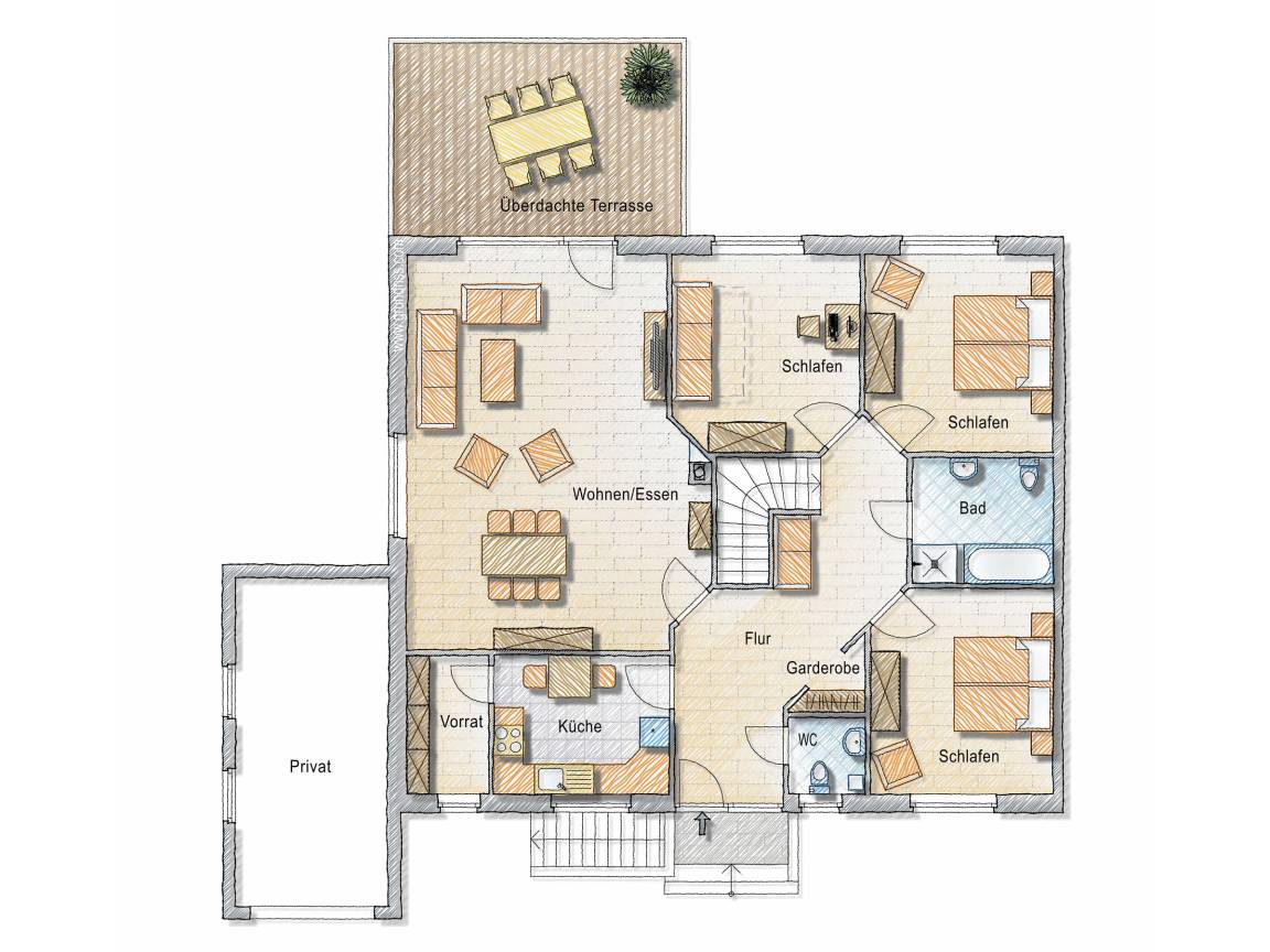 Im Ferienhaus im Bleitz ist auf gut 125qm Platz für die ganze Familie mit bis zu 6 Personen. Zwei Schlafzimmer sind mit einem Doppelbett ausgestattet. Im dritten Schlafzimmer steht ein Schlafsofa (140x190cm) zur Verfügung. Alle Schlafzimmer verfügen über einen Fernseher. Von dem sehr großzügigen Wohn-Esszimmer kommen Sie direkt auf die große überdachte Terrasse. Neben dem Bad mit Badewanne und Dusche steht zusätzlich ein separates Gäste-WC zur Verfügung. An die voll ausgestattete Küche mit zusätzlichem Essplatz grenzt ein großzügiger Abstellraum. Eine Waschmaschine befindet sich im Keller.