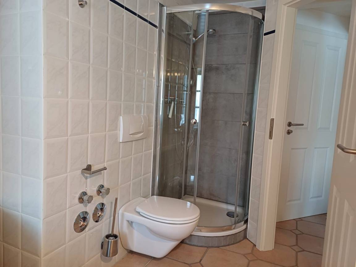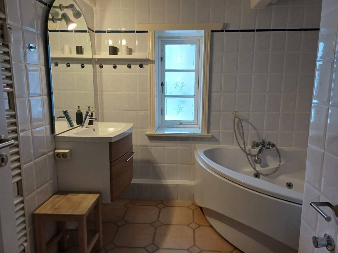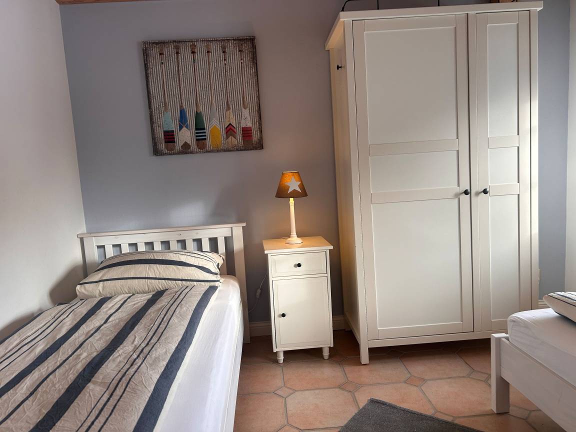 Angrenzend befinden sich zwei liebevoll eingerichtete Schlafzimmer – eines mit bequemem Doppel-Boxspringbett, das andere mit zwei Einzelbetten, ideal für Kinder. Das großzügige Badezimmer mit Dusche und Badewanne ist besonders familienfreundlich und lädt auch nach einem Strandtag zum Entspannen ein. Für ein Babybett ist ausreichend Platz vorhanden, sodass auch die kleinsten Gäste bestens untergebracht sind.