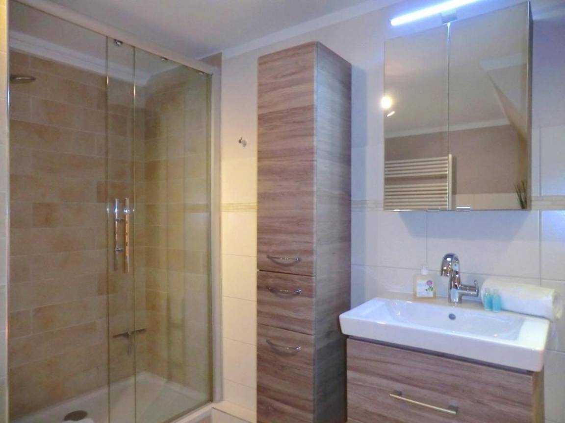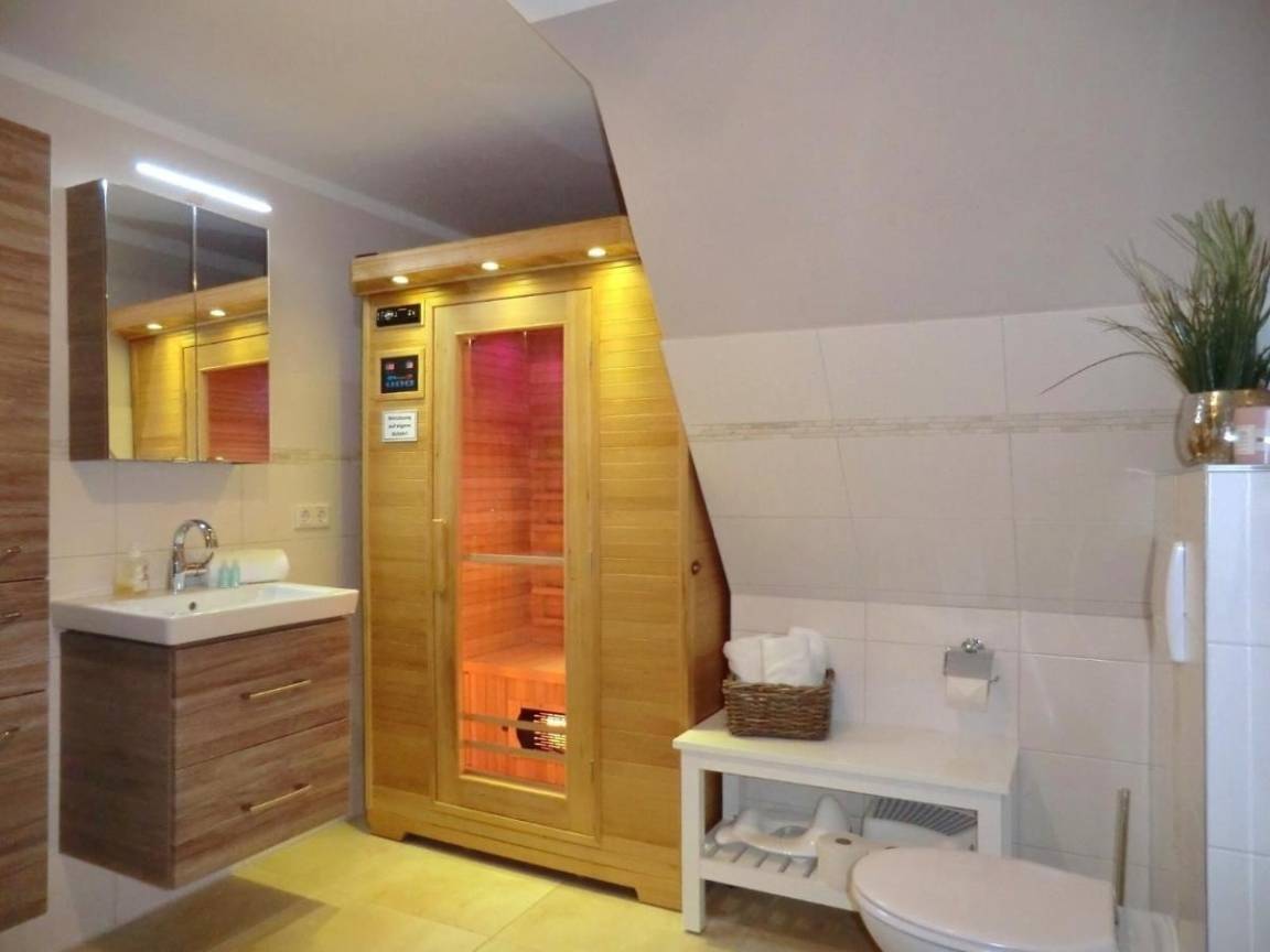 Im Erdgeschoss befindet sich ein Schlafzimmer mit Doppelbett, ein Badezimmer mit Dusche, die Küche mit kleinem Esstisch und der geräumige Wohn/Essbereich. Am großen Esstisch mit 6 Stühlen kann man hervorragend zusammen essen und trinken. Vom Wohnzimmer aus kommt man auf die eigene Terrasse. Im 1. Obergeschoss befinden sich zwei weitere Schlafzimmer und ein zweites Badezimmer mit einer kleinen Infrarotsauna.