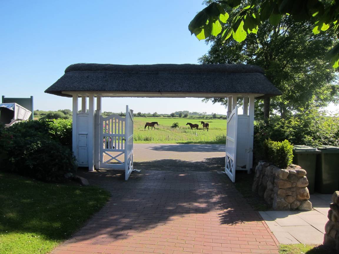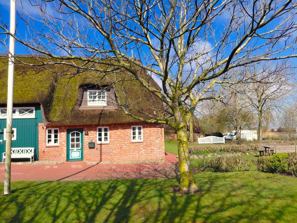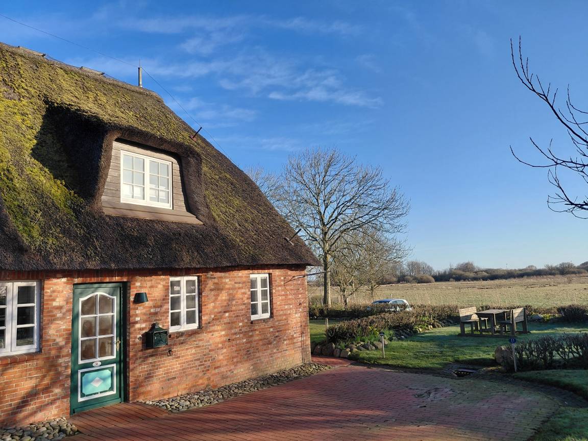 Die Ferienwohnung liegt in einem ruhigen Friesenhof - dem "Herrenhof "- am Ortsende von Wrixum . Sie bietet, umgeben von einem großzügigen Gartengelände mit vielen Obstbäumen und Heckenrosen, einen wunderschönen Blick über die Marsch.
