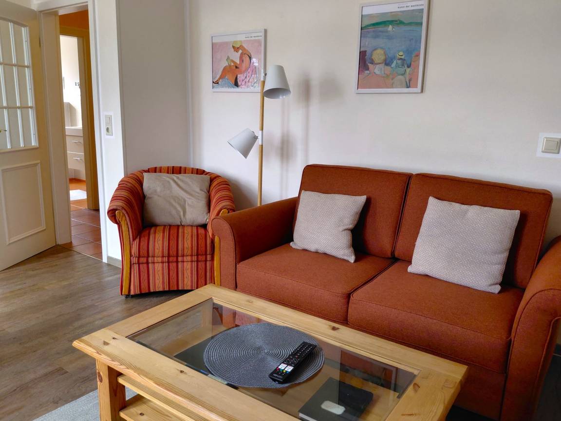 Zur Wohnung gehören ein eigener Gartenbereich mit Strandkorb (in den Sommermonaten) und eine skandinavische Sitzgarnitur auf der Wiese. Als Gäste können Sie zudem die gemeinsame Wiese mit schattenspendenen Obstbäumen nutzen . Hier befindet sich auch ein Spielbereich für die Kleinen.