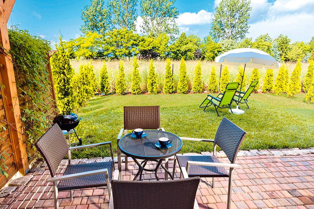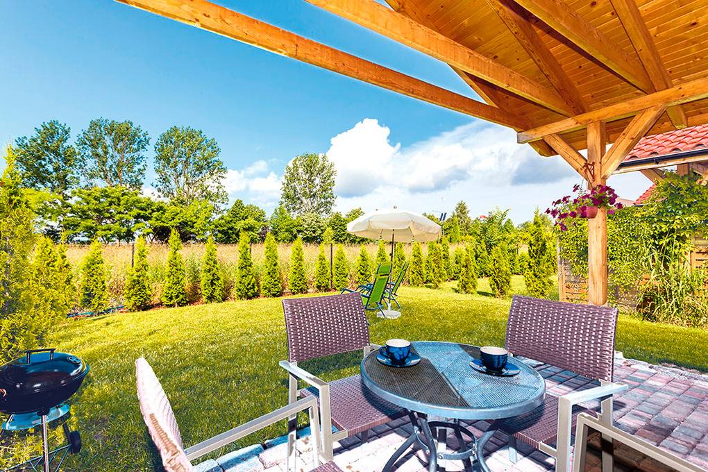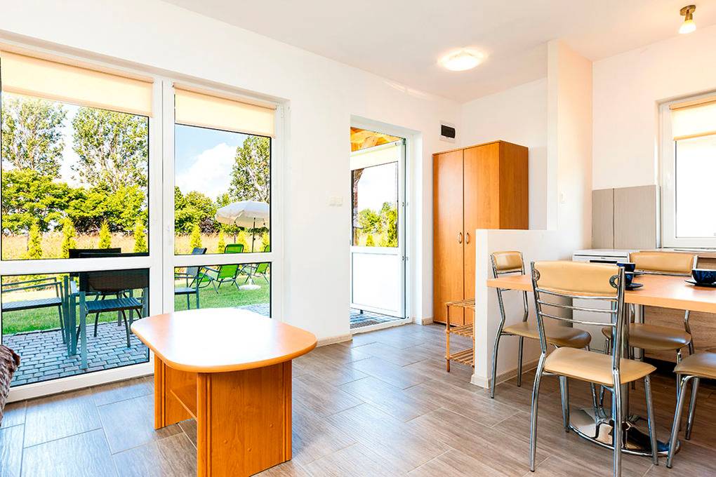PL 38.75 Ferienhaus 2-4 Pers.: 2-Zimmerhaus mit 35 qm Wohnfläche. Wohn-/Essraum mit Kamin, Sofa (Schlafcouch 2 Pers.), Sat-TV mit deutschen Programmen, Esstisch, Küchenzeile (Ceranfeld 2 Pl., Mikrowelle, Spülmaschine). Doppelzimmer. Bad/WC. Überdachte Terrasse mit Sitzmöbeln, Grill und anschließender Rasenfläche.