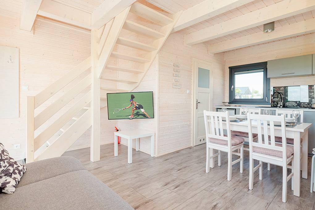 PL 38.77 Ferienhaus 2-6 Pers.: Gemütliches 3-Zimmerhaus mit 50 qm Wohnfläche über 2 Etagen. Parterre: Wohn-/Essraum mit Sofa (Klappcouch 2 Pers), Flachbild-TV, Esstisch, Küchenzeile (2 Ceran-Platten, Mikrowelle). Bad/WC. Dachgeschoß mit Schrägen: Zwei 2-Bettzimmer davon eines mit herrlichem Blick auf den Wrzosowski See. Terrasse mit Sitzmöbeln.