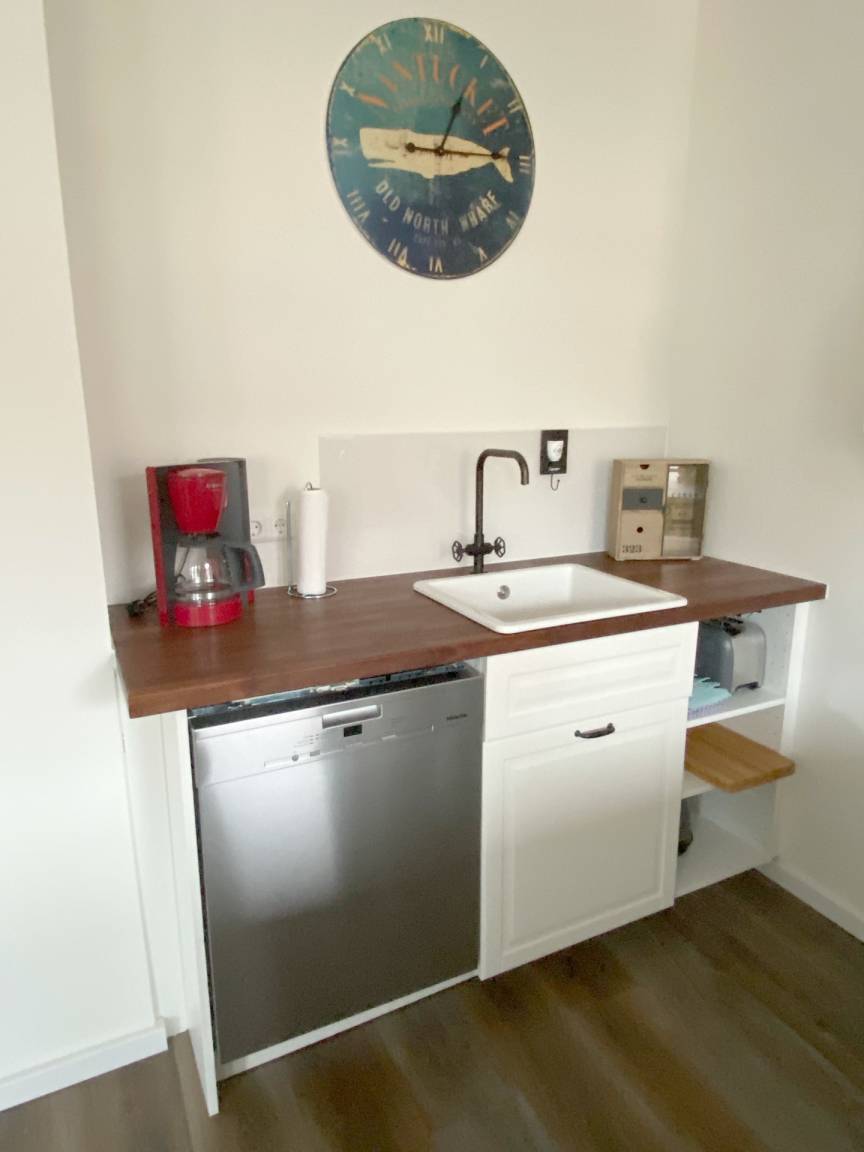 Zur Küche gehört außerdem eine Grundausstattung zum Kochen, Geschirr und Besteck, Edelstahl-Backofen, Weingläser, Backblech. Ein Esstisch ist auch vorhanden.
