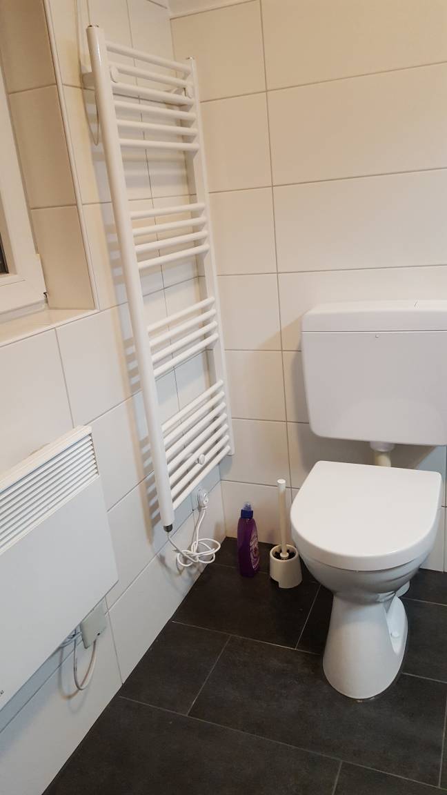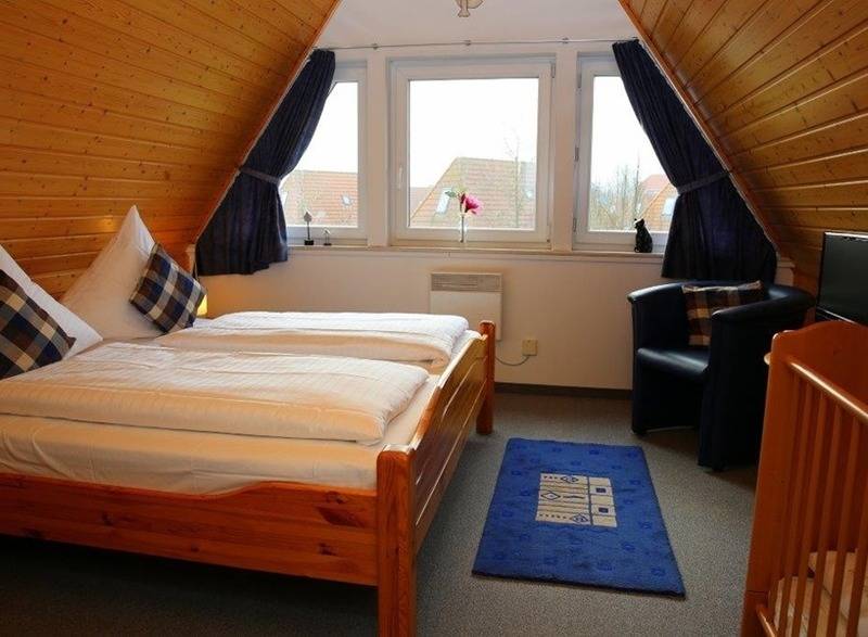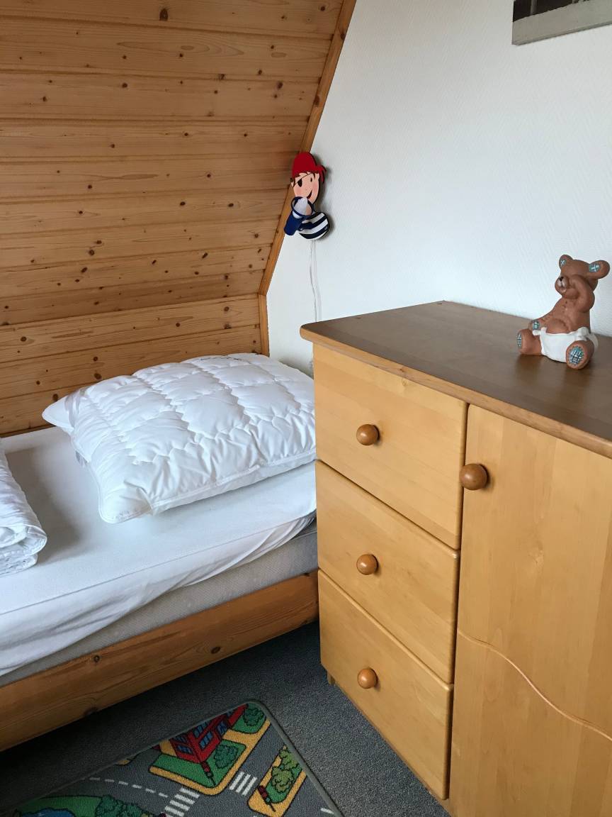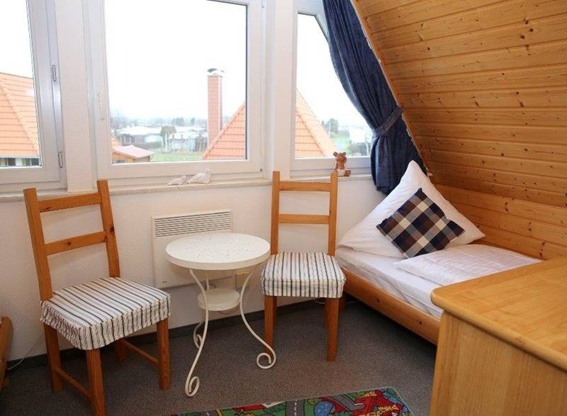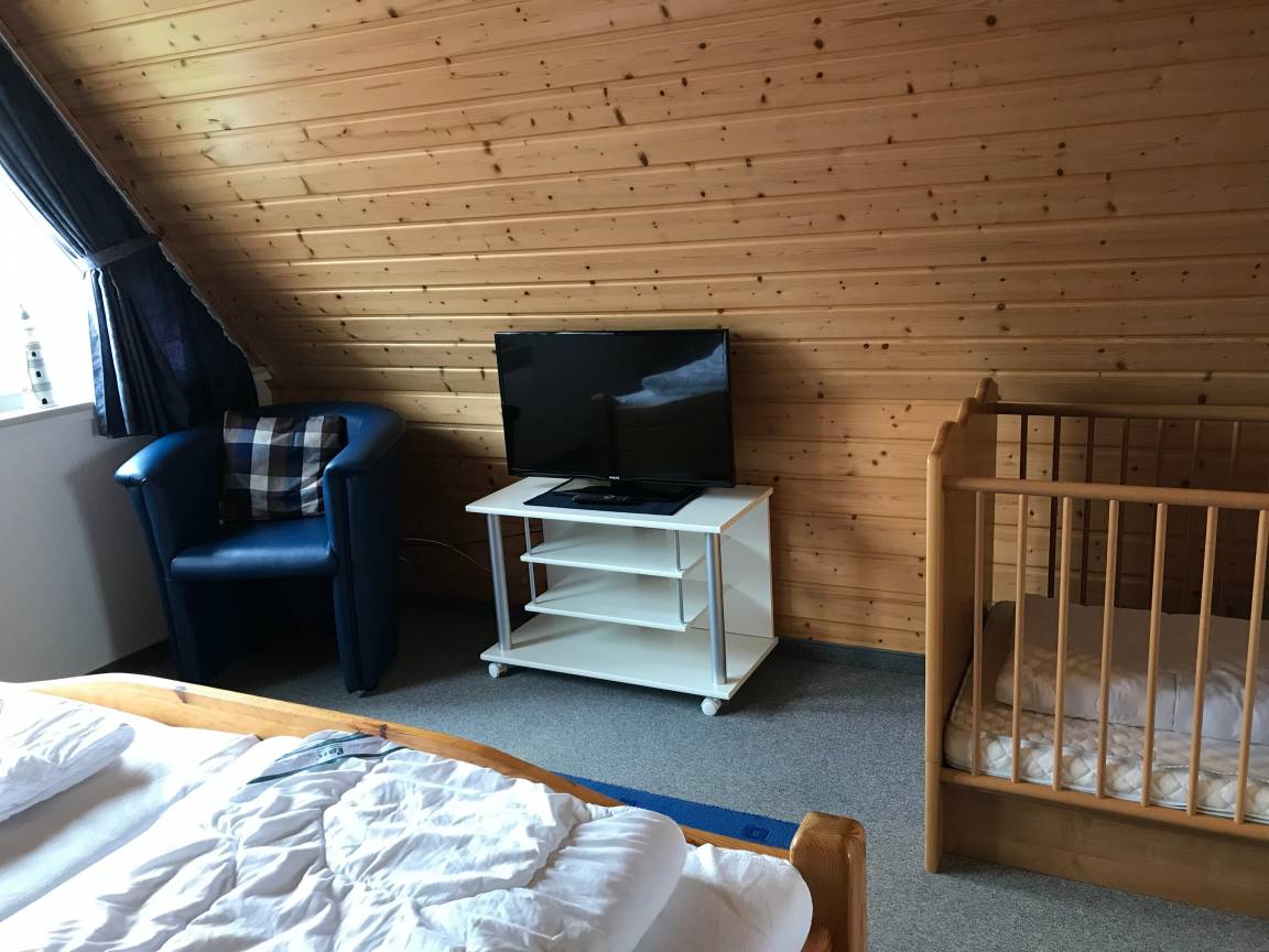 Im Obergeschoss befinden sich die beiden Schlafräume. Das Elternschlafzimmer hat ein Doppelbett, Kleiderschrank und Flachbild-TV. Das Kinderschlafzimmer hat zwei getrennt stehenden Betten.