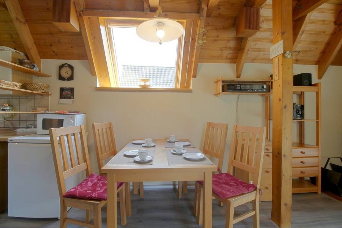 Das Haus verfügt über einen offenen Wohn-, Ess- und Küchenbereich im Erdgeschoss. Der Wohnbereich ist mt Vinylboden ausgestattet. Kaminofen, Flachbild-TV, Stereoanlage, VHS-Player, kostenloses Internet und eine sonnige Terrasse mit Gartenmöbeln und Strandkorb stehen Ihnen hier zur Verfügung.