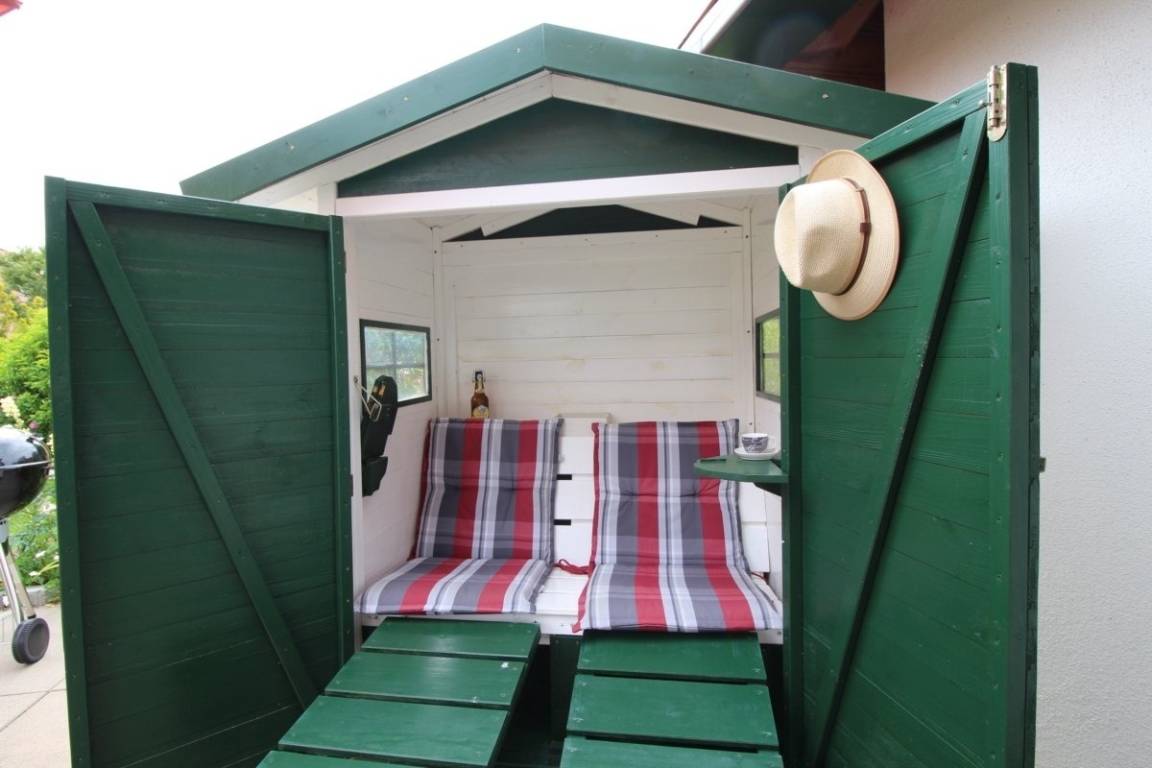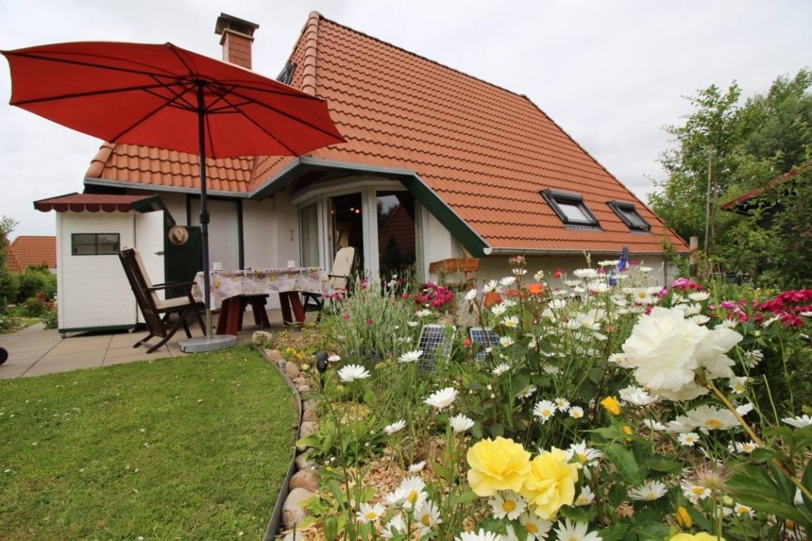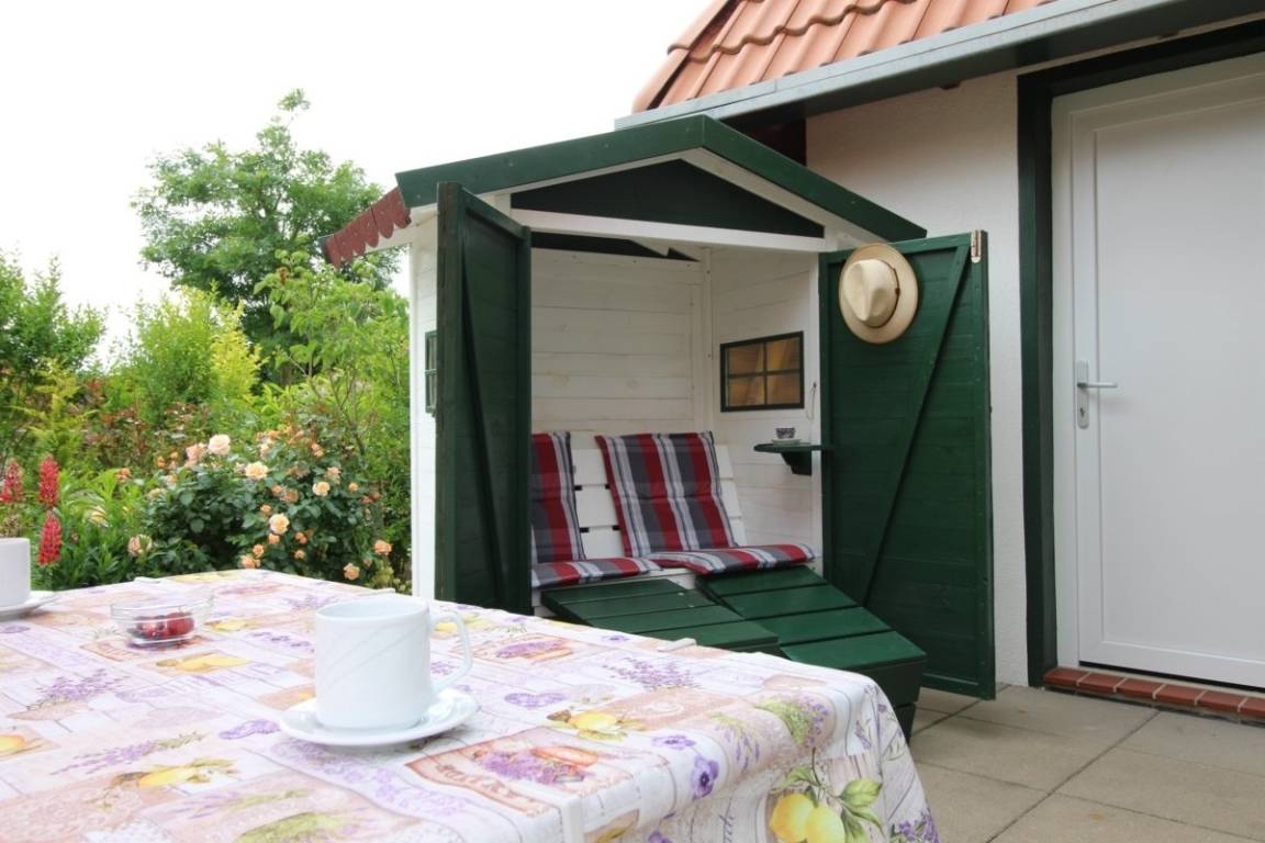 Die angrenzende Terrasse bietet einen schönen Blick in den hübsch angelegten Garten. Das sehr gelungene selbstgebaute Strandhaus lädt zu einem gemütlichen Beisammensein ein. Gartenmöbel, Sonnenliegen, Sonnenschirm und den Grill findet man im Abstellraum. Ebenfalls im Erdgeschoss ist ein Schlafzimmer mit 1 Einzelbett (90 x 200 cm) und Kleiderschrank. Verdunklungsmöglichkeiten sind vorhanden und das moderne Tageslicht-Bad mit fast ebenerdiger Dusche und Waschmaschine liegt direkt gegenüber.