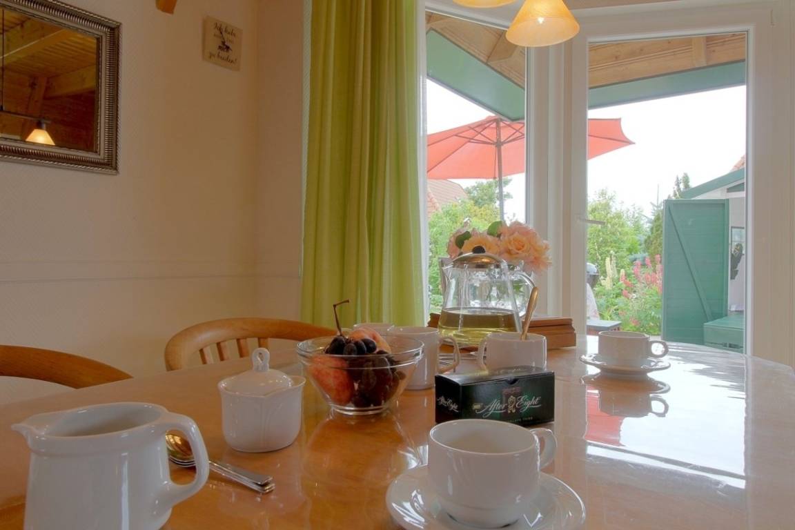 Das Erdgeschoss hat einen offenen Wohnbereich mit TV, CD, DVD, Radio und Kochkamin sowie den Essplatz mit Einbauküche (Kühlschrank, Gefrierschrank, Ceran Kochfeld, Mikrowelle, Backofen, Kaffeemaschine, Wasserkocher, Eierkocher, Toaster, Waffeleisen, Raclette-Gerät, Spülmaschine und reichlich Geschirr). Die geschmackvolle Einrichtung zieht sich durchs ganze Haus. Ein Kochherd, als Ofen zu gebrauchen, sorgt für Erinnerungen an die Ferien bei der Großmutter.