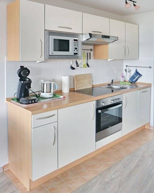 Küche: Geschirr, Töpfe, Mikrowelle, Kühlschrank inkl. Gefrierfach, Backofen, E-Herd mit Ceranfeld, Wasserkocher, Kaffeepad- sowie Filterkaffeemaschine, Toaster, Eierkocher, Geschirrspüler