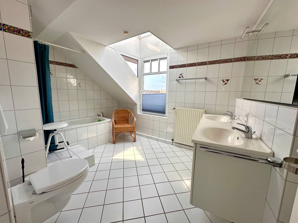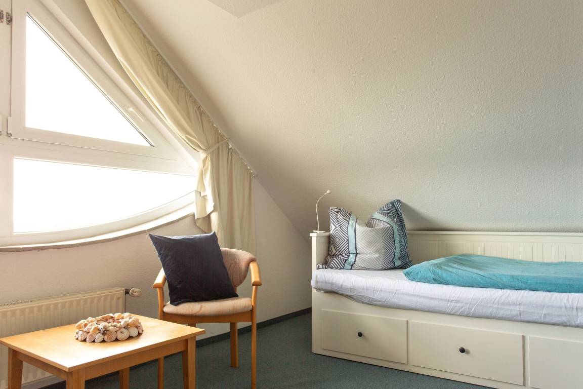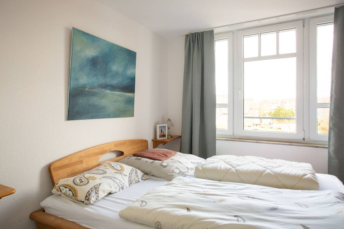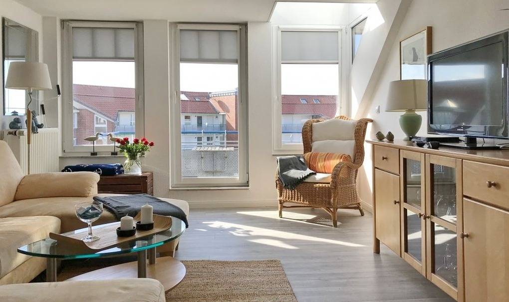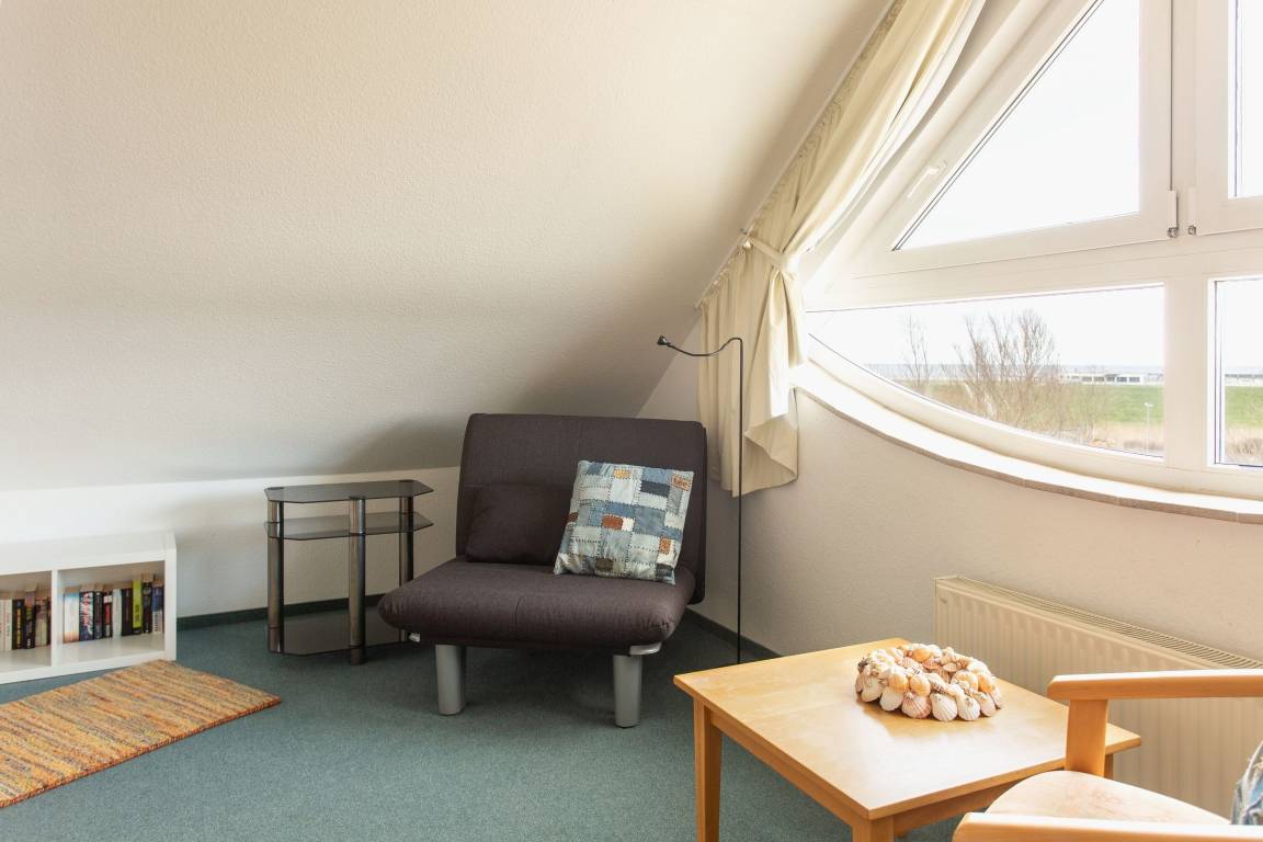 Die Meerblick-Wohnung De Luuvsiet ist 65 qm groß und geht über 2 Etagen. Auf der unteren Ebene hat sie ein Schlafzimmer, ein großes Badezimmer mit Badewanne, WC und Waschbecken und Fenster, ein großes Wohnzimmer mit Essecke sowie eine Küche mit Geschirrspüler, Backofen, Ceranfeld, Kaffeemaschine und Kaffeepadmaschine. Ein LCD-Fernseher, eine Hifi-Anlage sowie ein DVD-Player sind ebenfalls vorhanden.