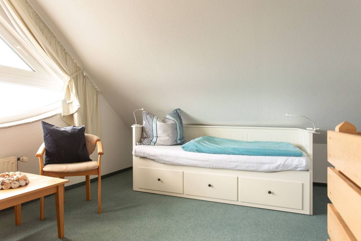 Im Obergeschoss befindet sich ein Bett, welches zu einem Doppelbett umgebaut werden kann.