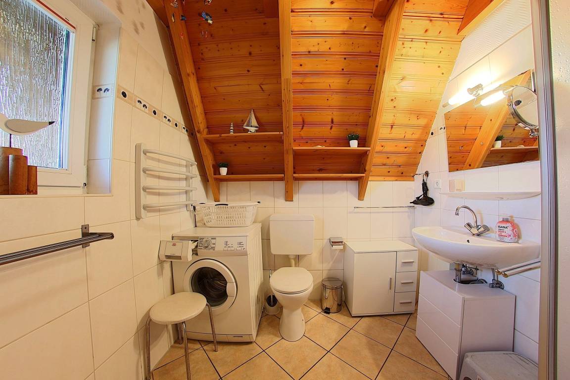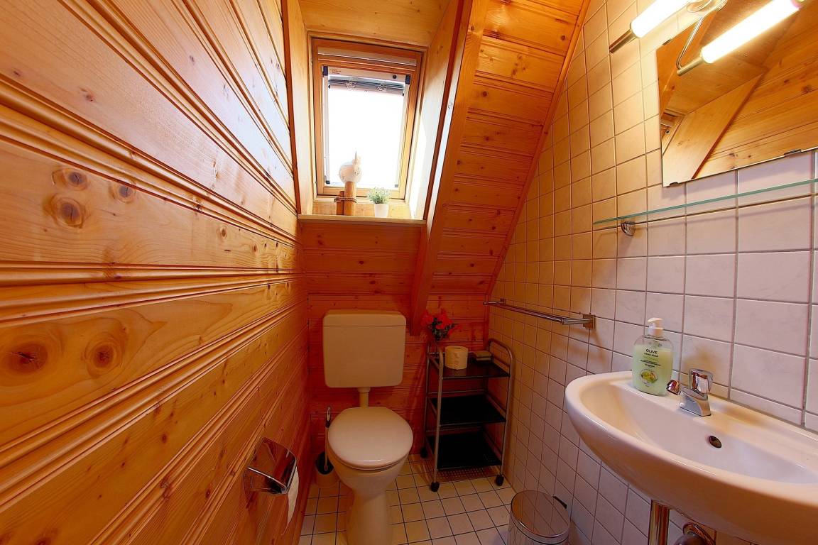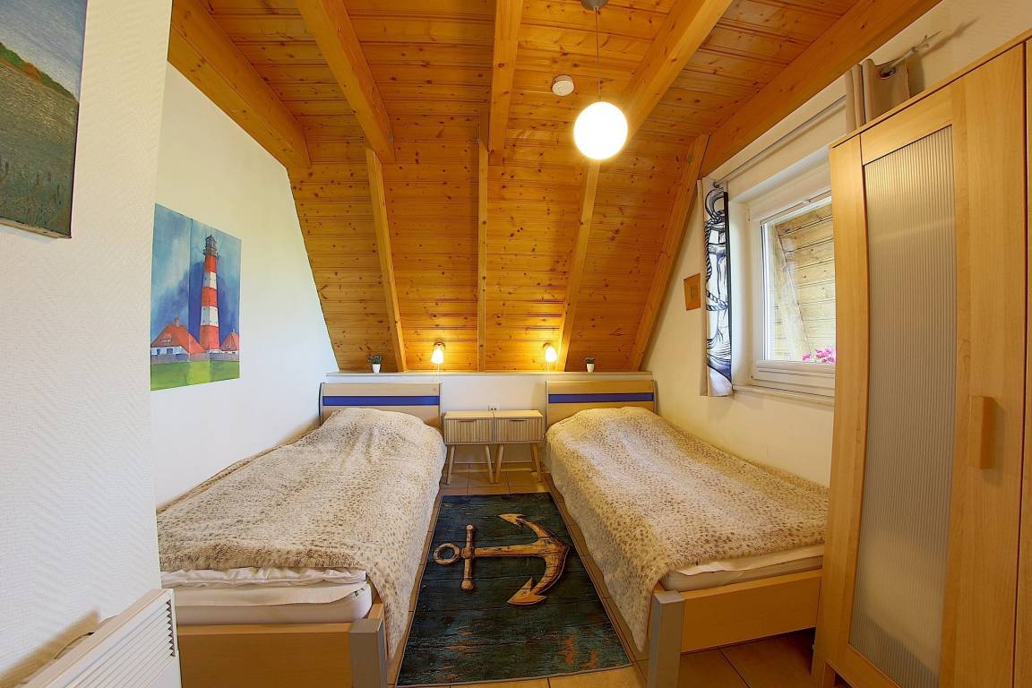 Ein Schlafzimme mit 2 Einzelbetten und das Duschbad befinden sich ebenfalls im Erdgeschoss. Im Obergeschoss finden Sie das Elternschlafzimmer mit Doppelbett und Flachbild TV, sowie ein Kinderzimmer mit 2 Einzelbetten und ebenfalls mit TV. Ein WC ist ebenfalls im Obergeschoss vorhanden.