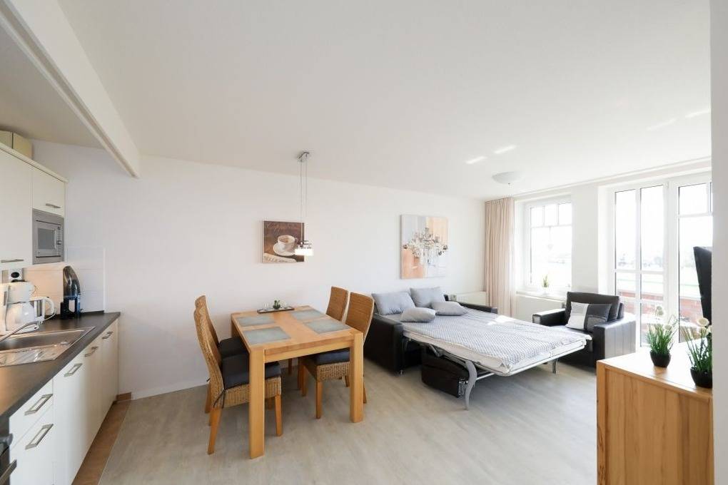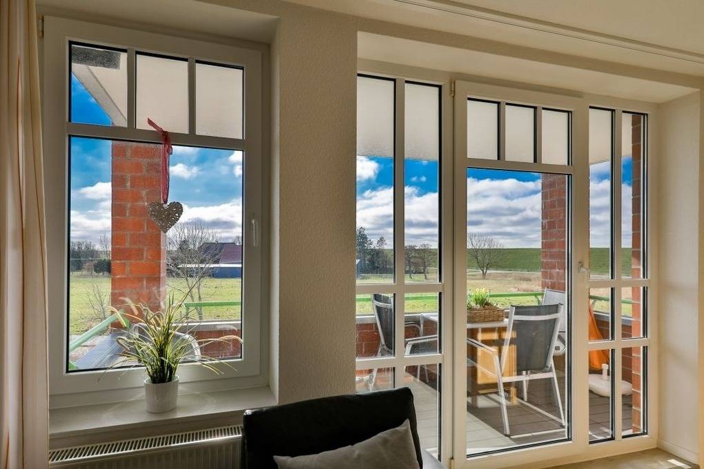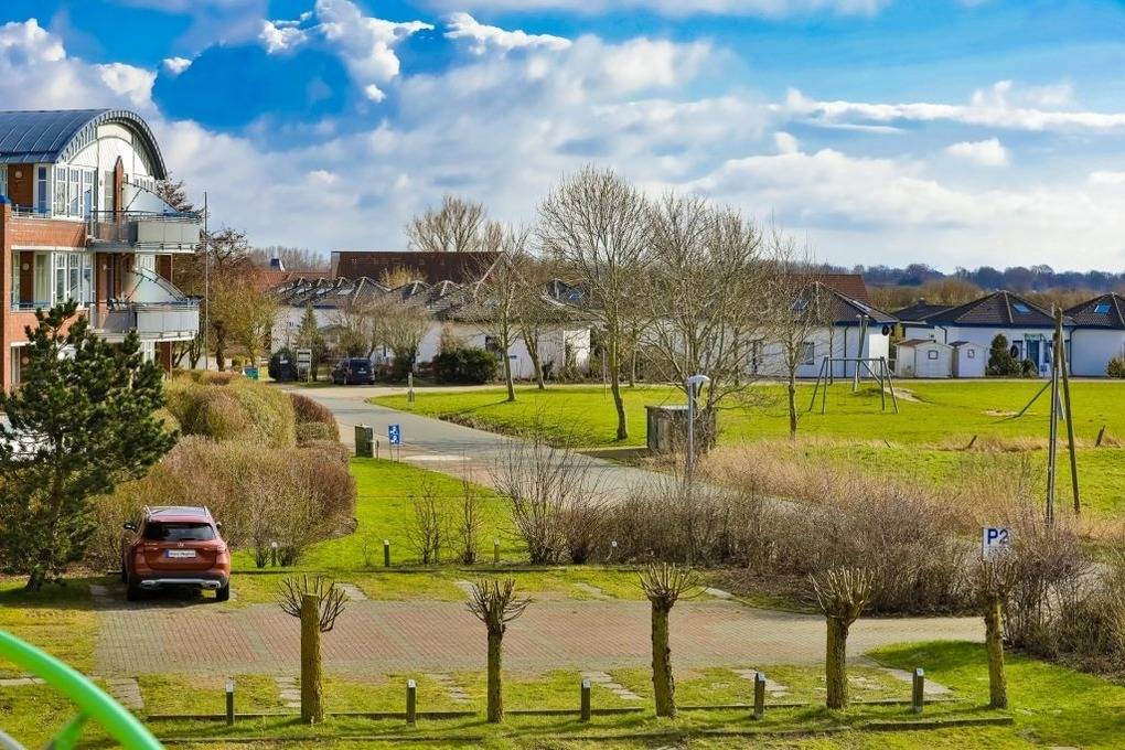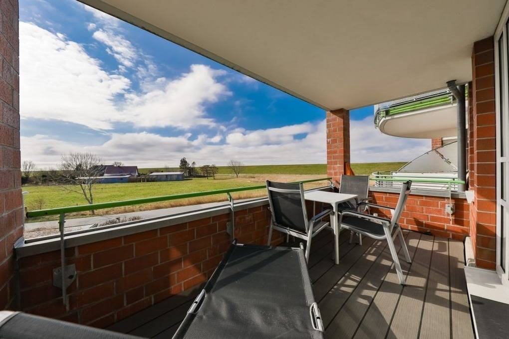 Der große möblierte Balkon bietet eine schöne Aussicht auf das Grün und den Deich und ist von morgens bis zum Sonnenuntergang sonnig. Alle Fenster und die Terrassentür sind mit Insektenschutz ausgestattet und im Wohnzimmer gibt es elektrische Außenjalousien.