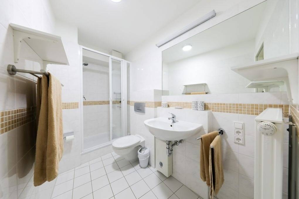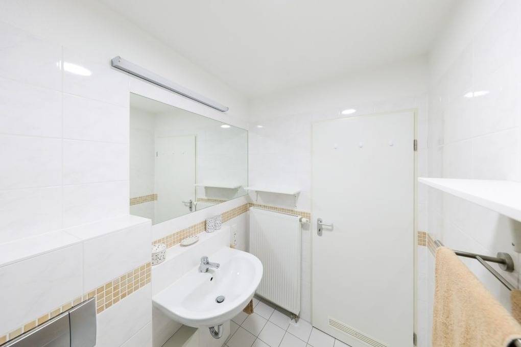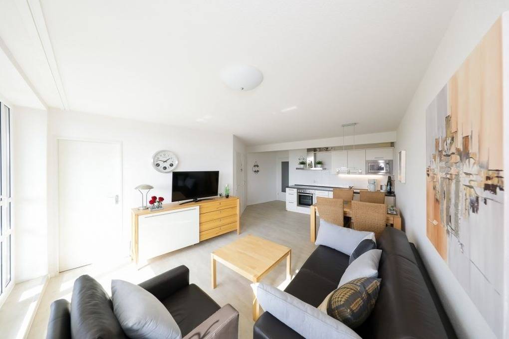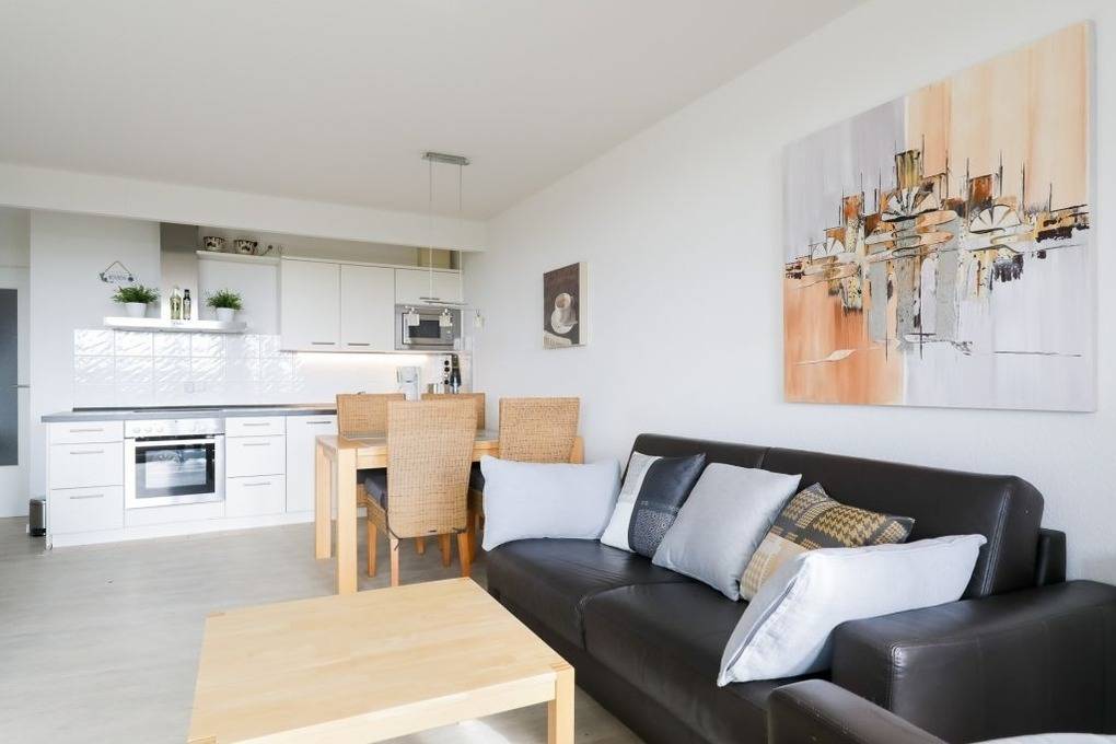Die Wohnung befindet sich in ruhiger Lage im Ferienhaus Neptun und ist 56 qm groß. Sie besteht aus einem Wohn-Esszimmer mit LCD-Fernseher, aufklappbarer Schlafcouch, Essecke und komplett ausgestatteter Küchenzeile, einem Schlafzimmer mit Doppelbett, einem kleinen Zimmer mit Schlafcouch und einem Badezimmer mit Dusche.