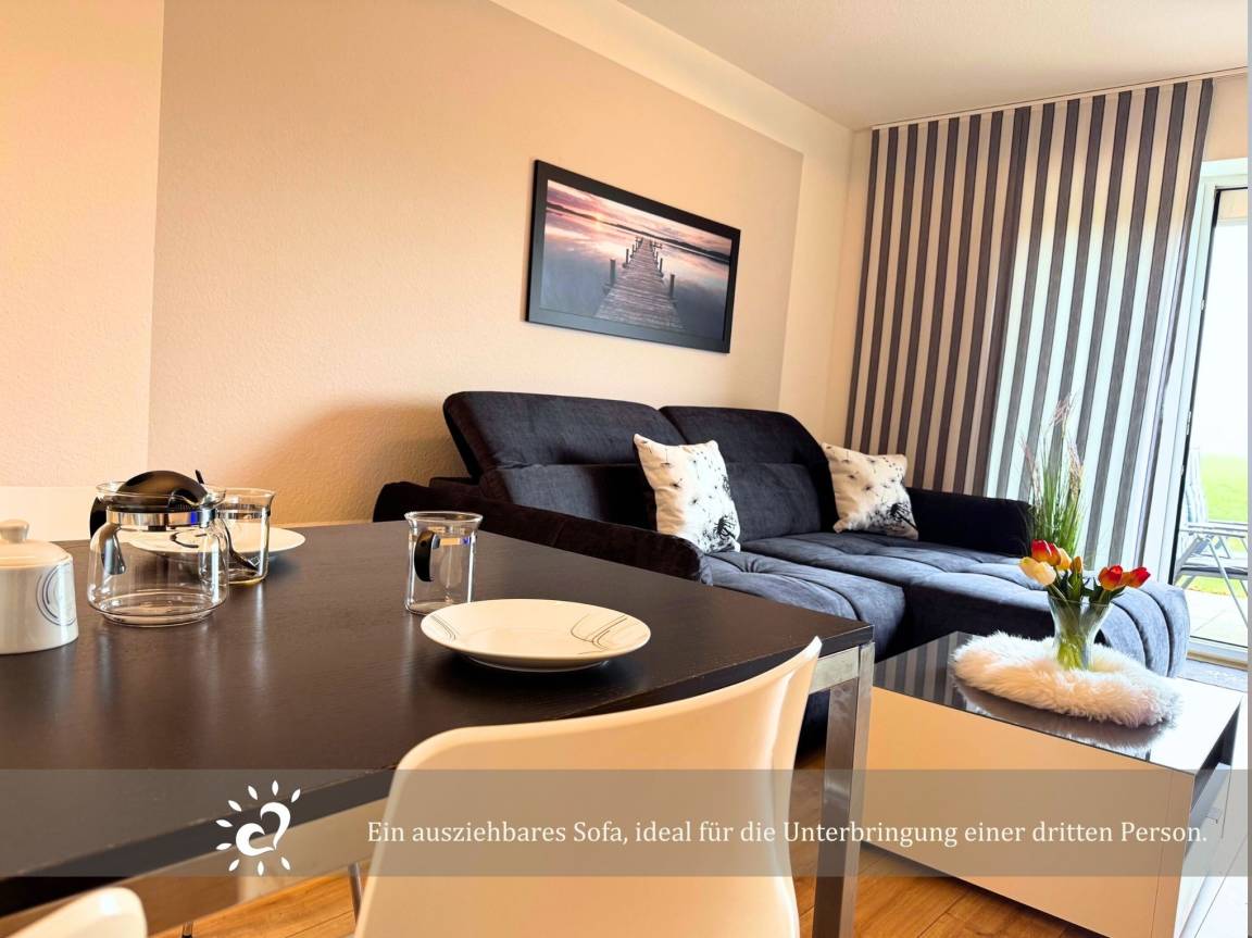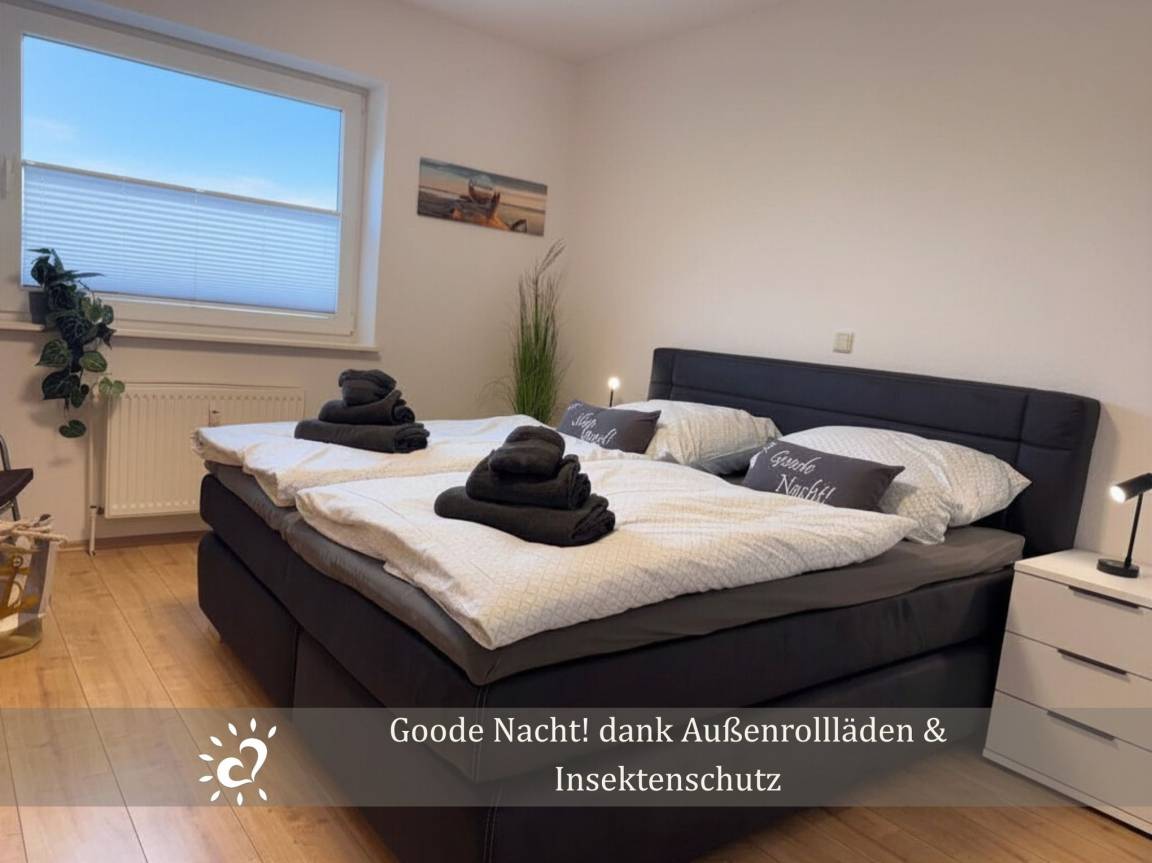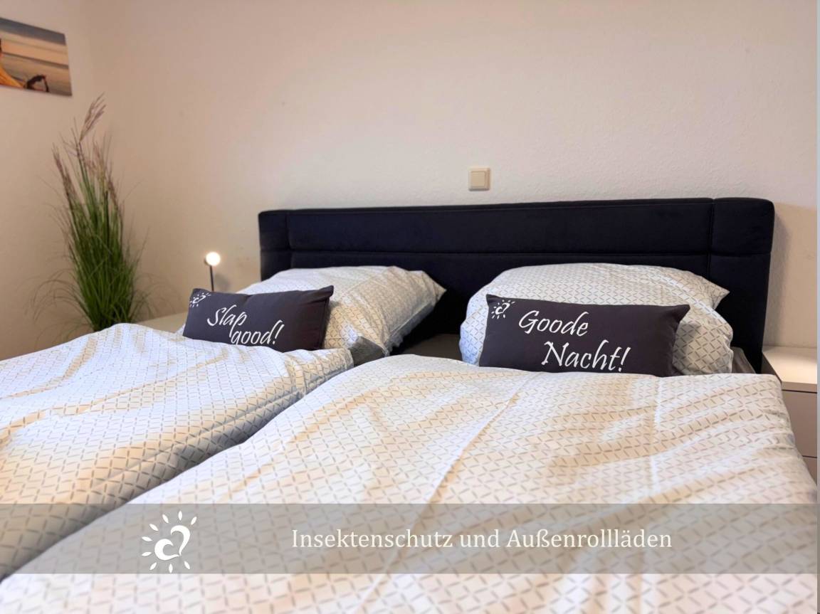 Die Erdgeschosswohnung bietet ein gemütliches Schlafzimmer, einen hellen frisch renovierten Wohnbereich mit Küche, alles, was du für einen entspannten Urlaub benötigst Für deinen Komfort gibt es Außenrollläden und Insektenschutz, damit du ungestört schlafen und trotzdem die frische Nordseeluft genießen kannst.