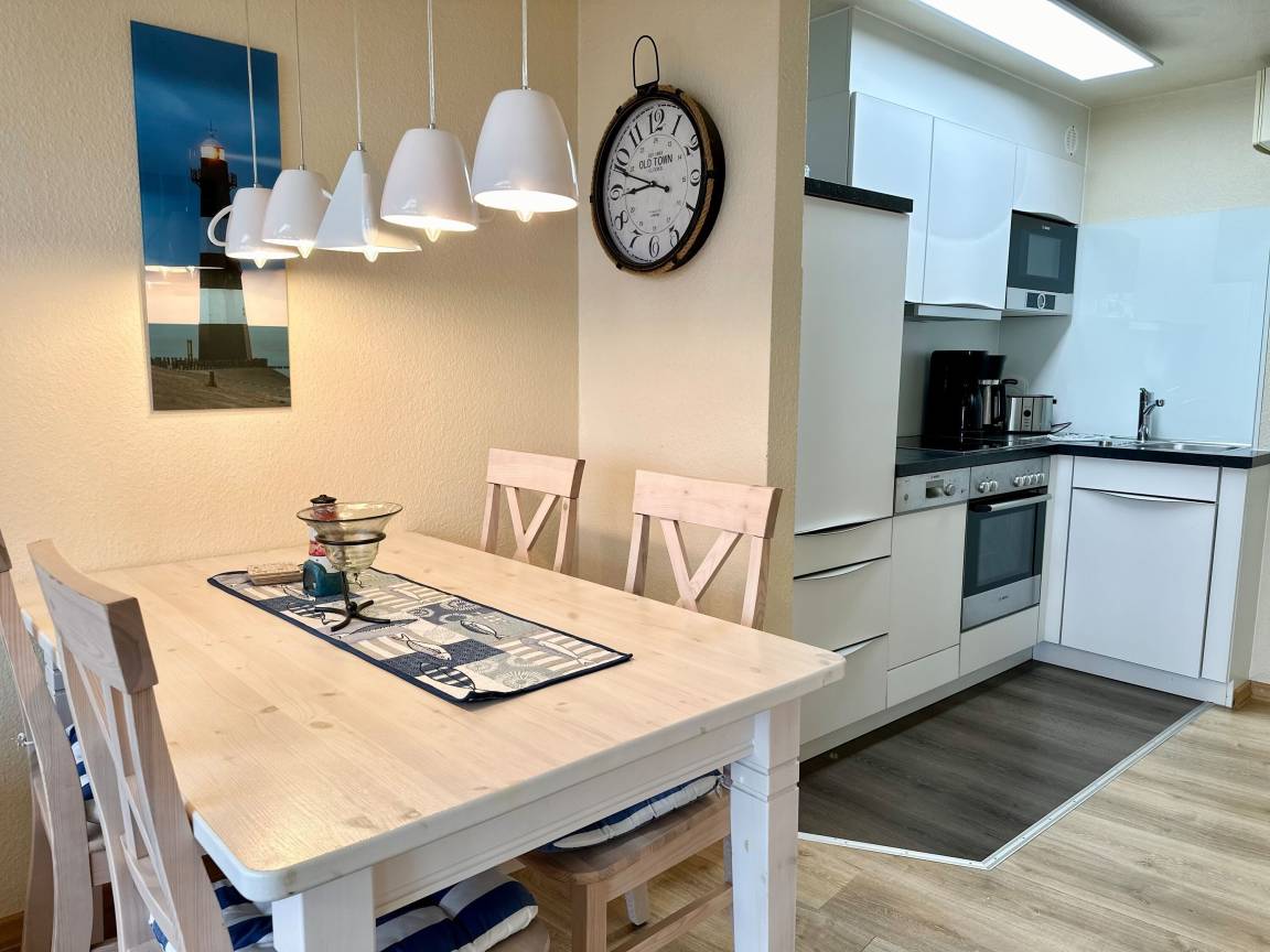 Im hellen Wohnzimmer mit großer Fensterfront und Essbereich können Sie entspannen und die Küchenzeile mit Geschirrspüler, Backofen und Ceranfeld lädt zum Kochen ein. Träumen Sie schön in den beiden Schlafzimmern: eines ist mit einem Doppelbett und eines ist mit zwei Einzelbetten (über die Treppe in der Wohnung erreichbar) ausgestattet.