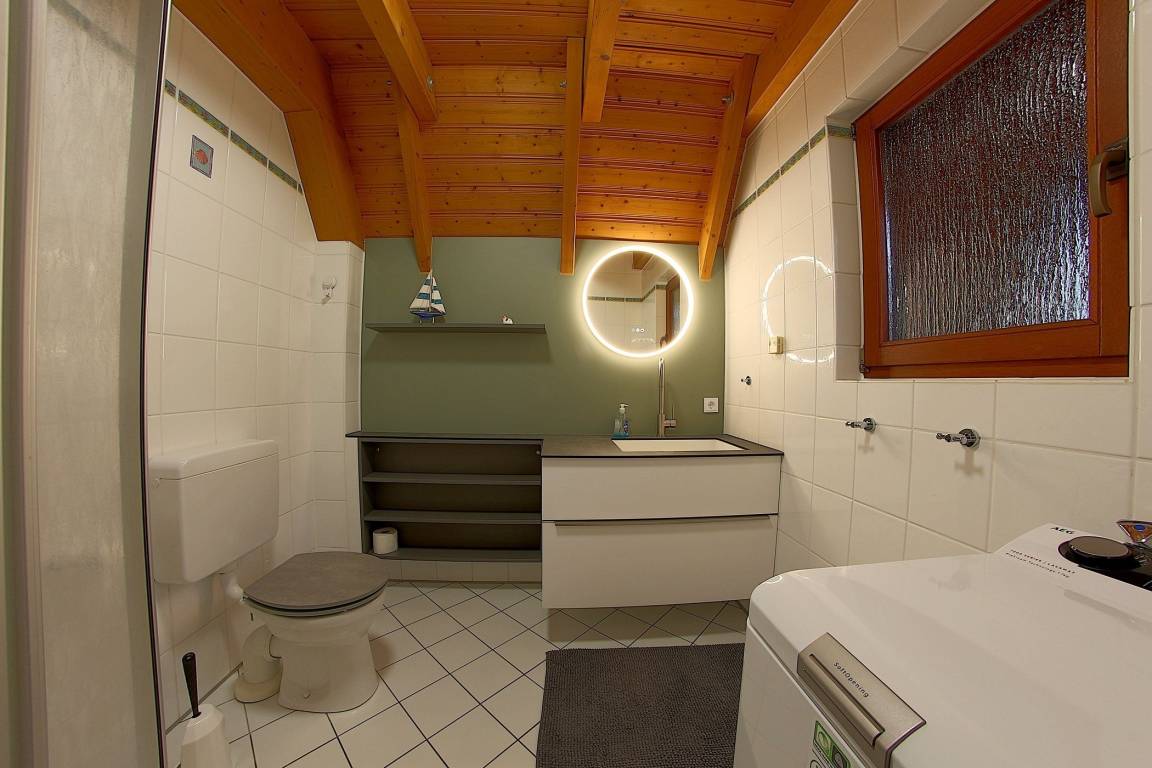 Im Obergeschoss befinden sich zwei Schlafzimmer mit einmal Doppelbett, TV und Babyreisebett und eins mit zwei Einzelbetten. Ebenfalls befindet sich ein WC im Obergeschoss. Das Obergeschoss ist mit hellem eldlen Holz vertäfelt und PVC Boden ausgestattet.