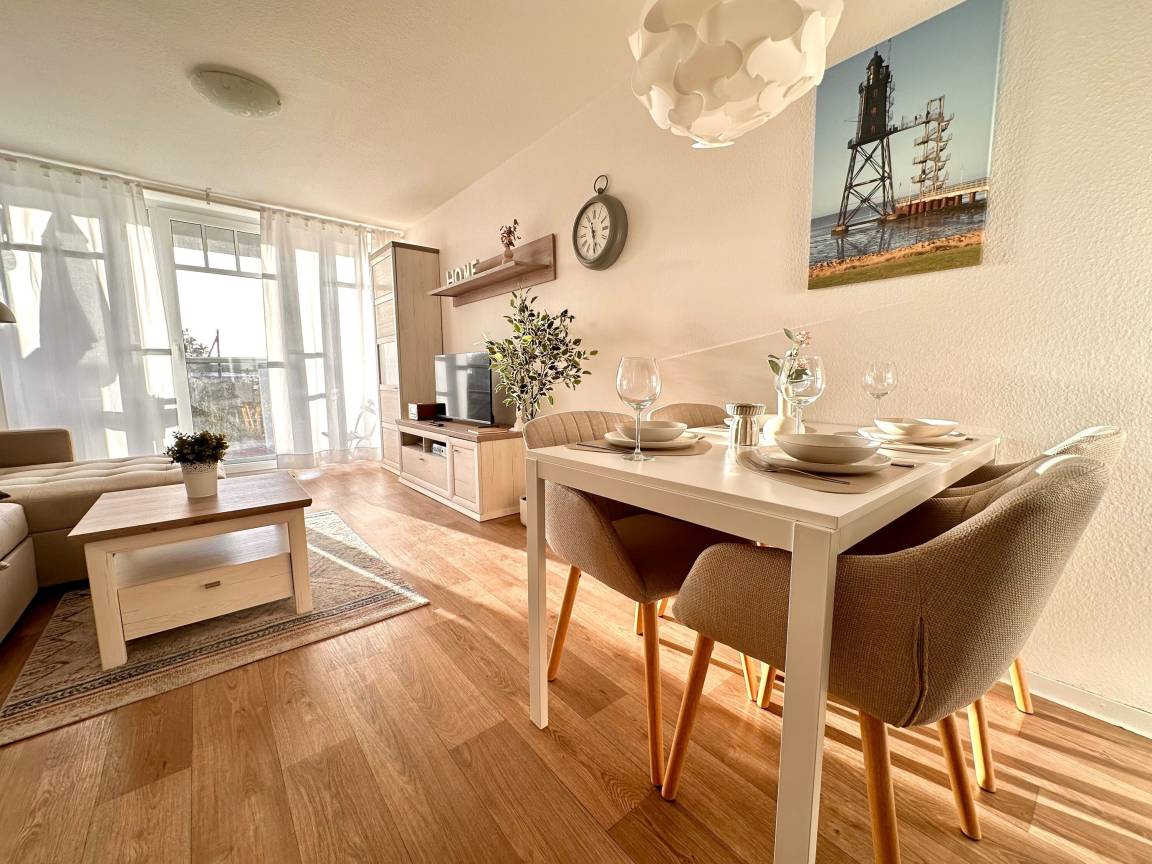 Gönnt euch eine entspannte Auszeit an der Nordsee! Unsere frisch renovierte und komplett ausgestattete Komfortferienwohnung bietet auf ca. 54 m² alles, was ihr für einen erholsamen Urlaub braucht. Von hier aus habt ihr einen wunderschönen Blick auf den Deich und könnt an mehreren gemütlichen Plätzen rund um die Wohnung die frische Nordseeluft genießen und einfach entspannen.