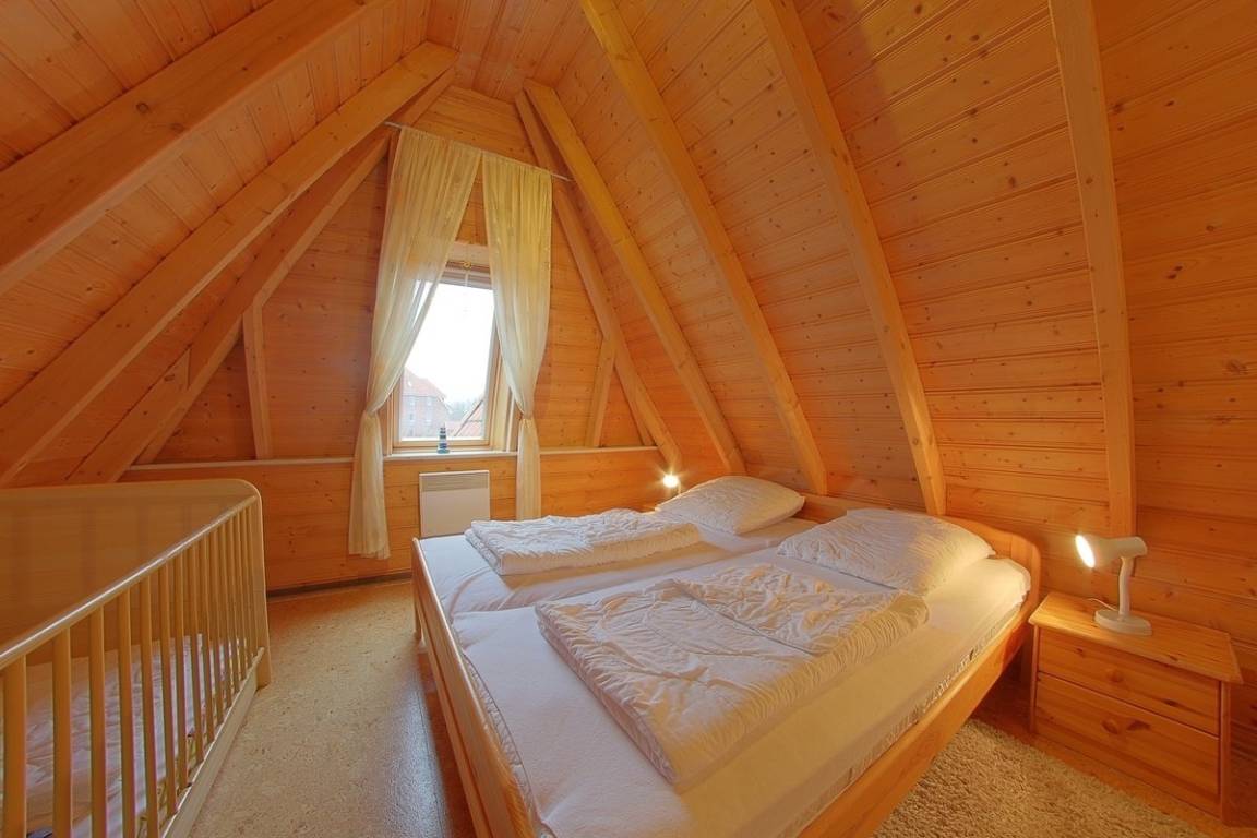 Im Obergeschoss befinden sich zwei weitere Schlafzimmer und ein WC mit Waschbecken. Ein Schlafzimmer mit Doppelbett und Babyreisebett für ein Kleinkind und ein weiteres Schlafzimmer mit 2 Einzelbetten. Beide Zimmer im OG haben je einen kleinen Schreibtisch plus Stuhl