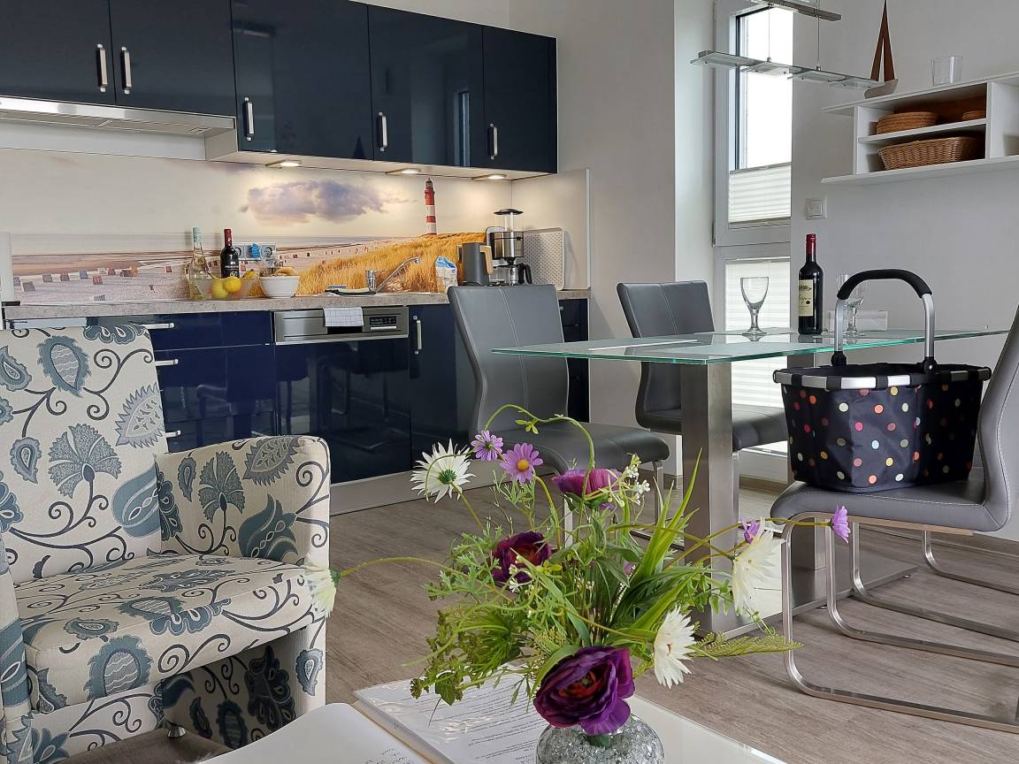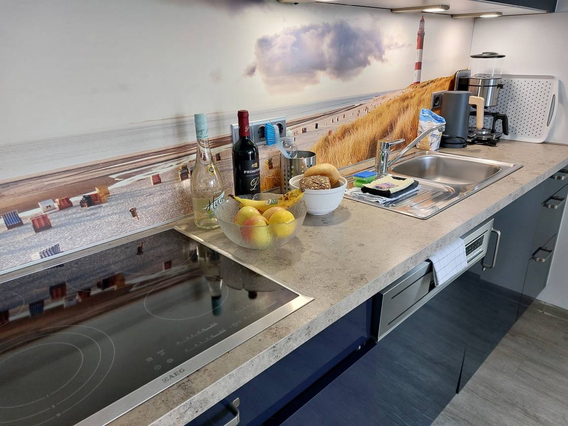 Im Wohnzimmer ist eine hochwertige Küche integriert, die komplett ausgestattet ist (z.B. mit Mikrowelle, Backofen, Toaster, Gläser, Geschirr, Eierkocher, Ceran-Kochfeld, Kaffeemaschine, Geschirrspüler.... Ein großer Flachbildschirm im Wohn- sowie im Gästezimmer sorgt für mediengerechte Unterhaltung.