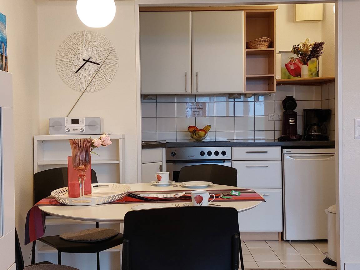 In der gut ausgestatteten Küche finden Sie u.a. einen Kühlschrank mit kleinem Gefrierfach, 4-Platten-Herd, Backofen, Mikrowelle, Kaffeemaschine und Pad-Kaffeemaschine, Wasserkocher und Toaster. Ein Geschirrspüler rundet die Aussstattung in der Küche ab.