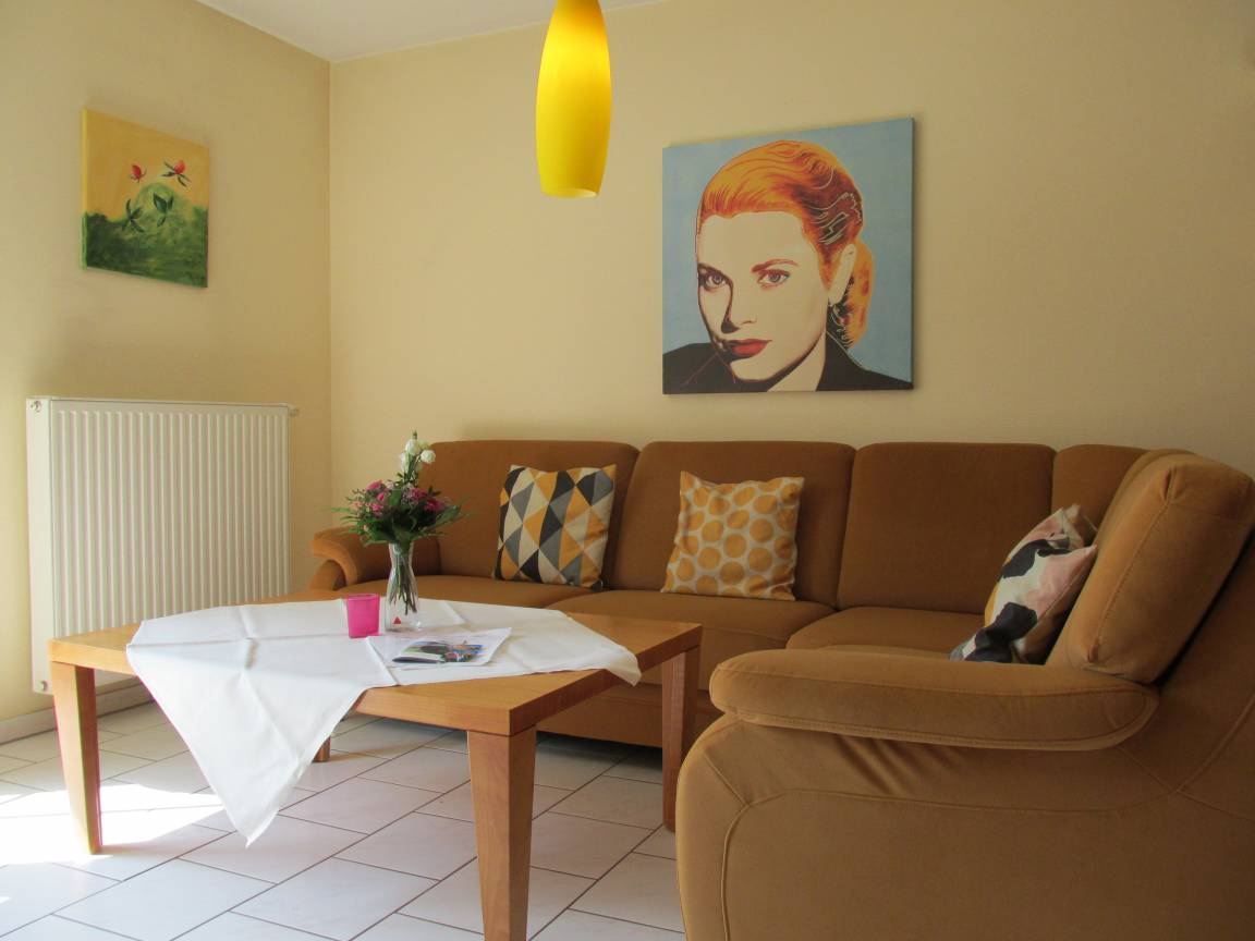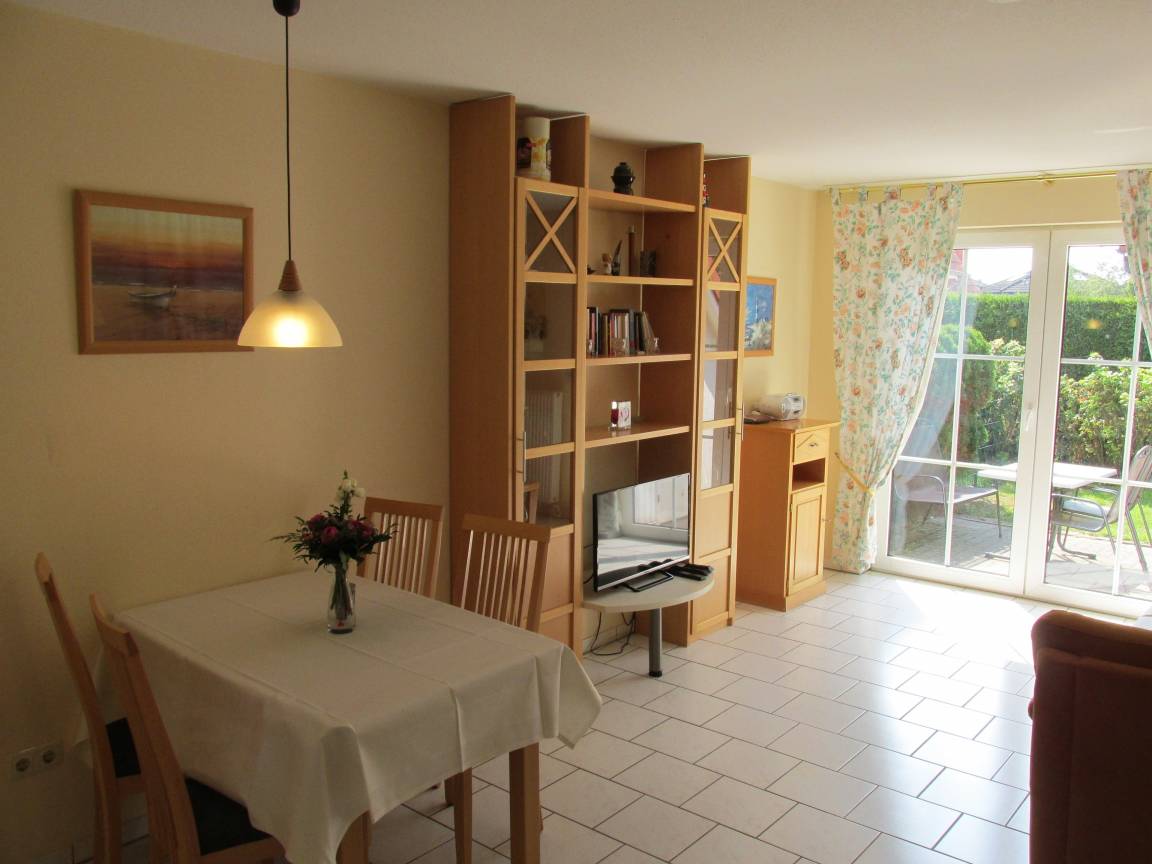 Der Wohnbereich mit gemütliche Eckcouchgarnitur, Flach-TV, Wlan, Essbereich für 4 Personen und Kinderhochstuhl bietet genügend Platz für erholsame Familientage an der Nordsee.