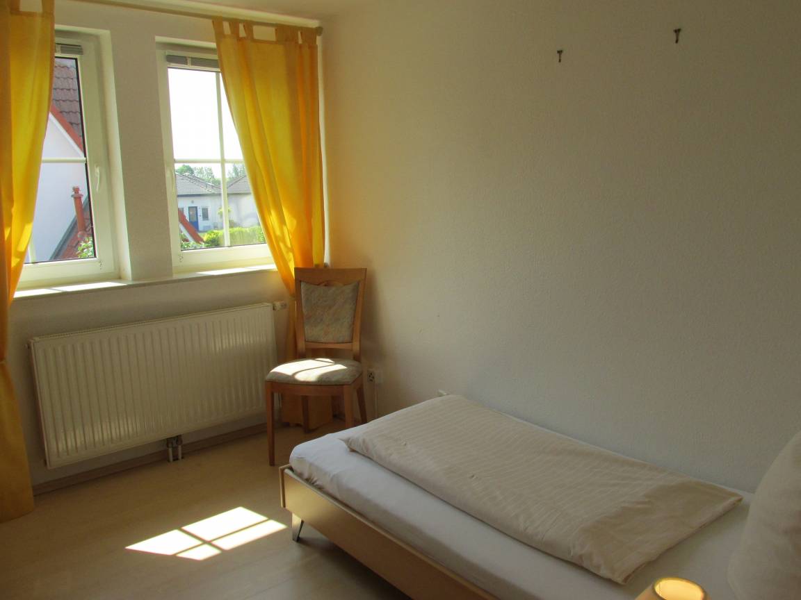 Im Kinderschlafzimmerzimmer/Gastzimmer sind 2 Einzelbetten + Kleiderschrank, leichte Verdunklung möglich.