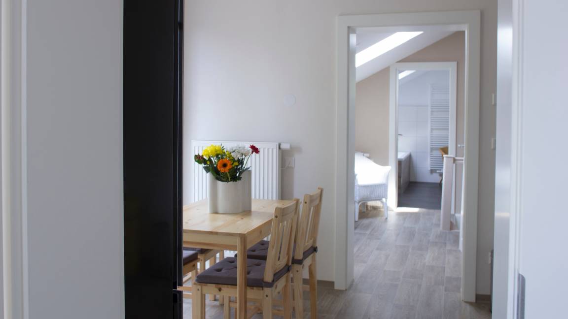 Ein Hund bis 10 kg ist nach Anfrage und gegen Aufpreis von 8 ,- € pro Nacht erlaubt. Die Ferienwohnung verfügt über zwei DZ mit jeweils einem Schlafsofa, einer voll ausgestatteten modernen Gemeinschaftsküche mit Balkon und ein modernes Gemeinschaftsbad.Räume & Aufteilung