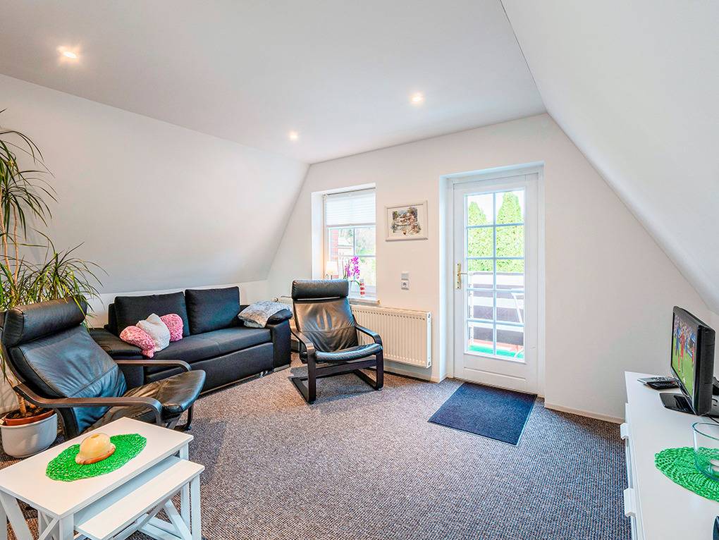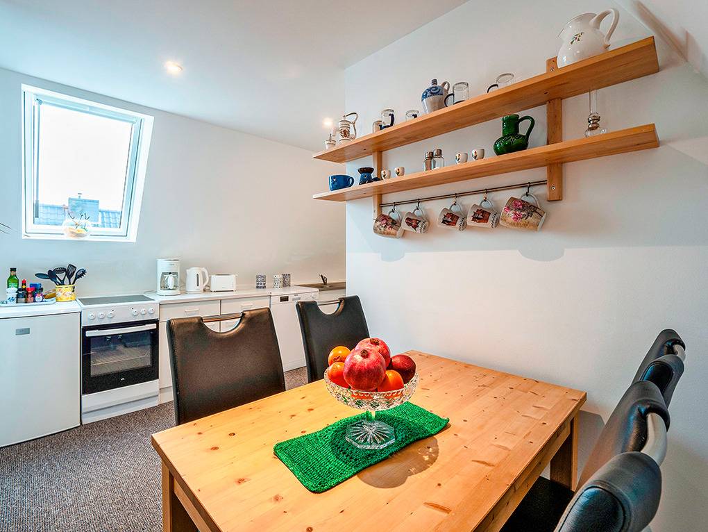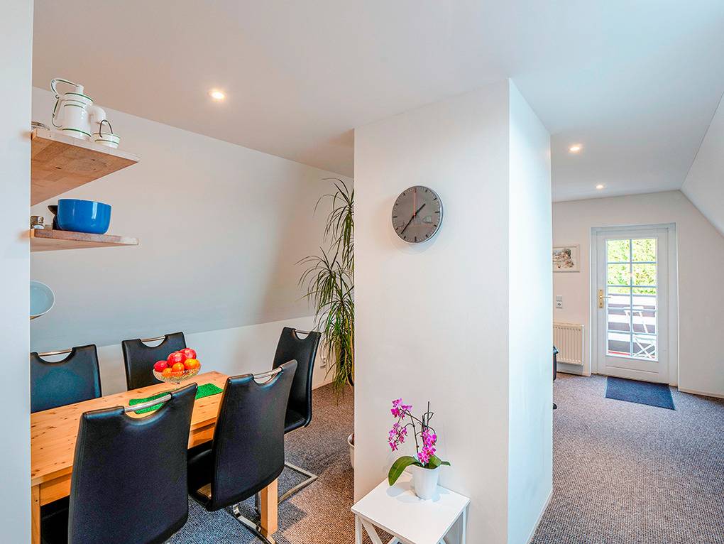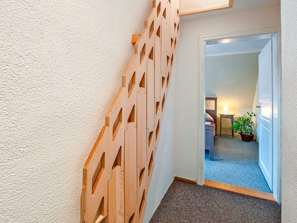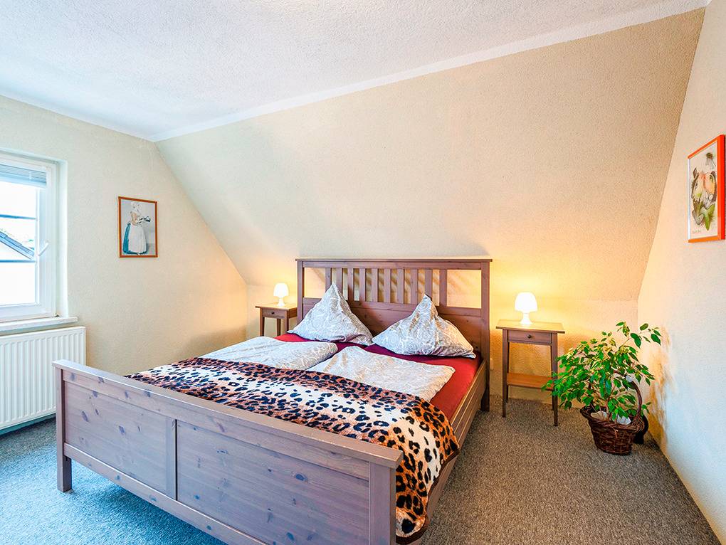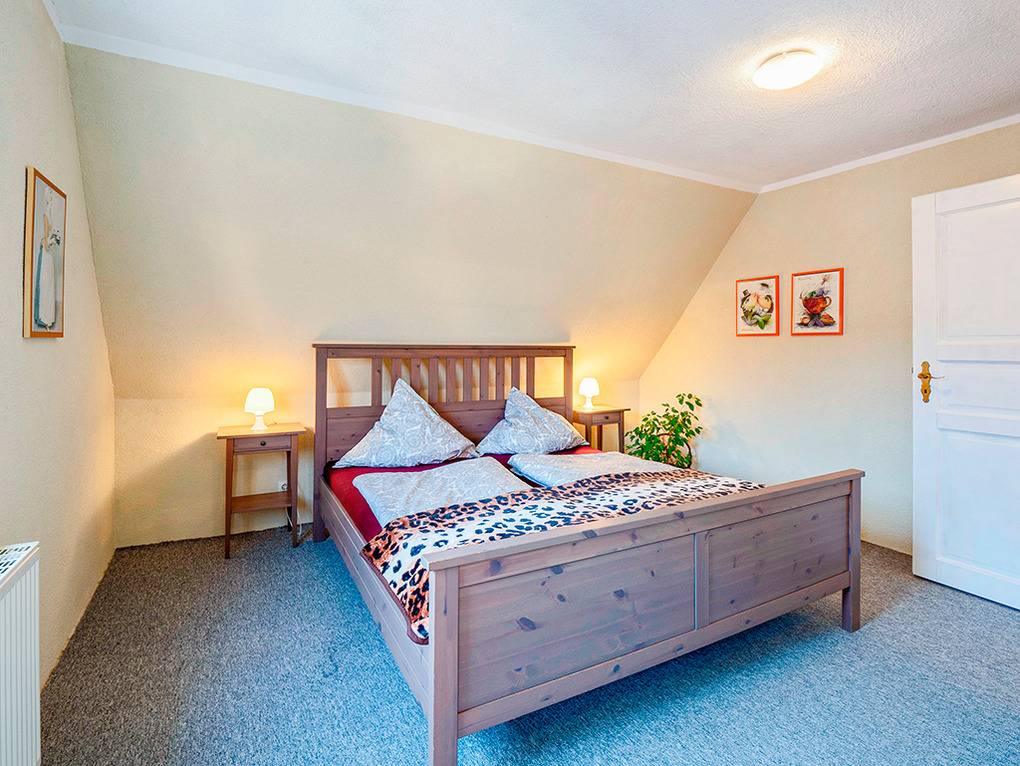D 61.27 Wohnung 1-4 Pers.: 3-Zimmerwohnung mit 65 qm Wohnfläche über 2 Etagen mit Dachschrägen, 1. Etage, separater Zugang über Außentreppe. Großzügiger Wohn/-Essraum mit Couchgarnitur (Ausziehcouch 2 Pers.), Sat-TV, Esstisch, Küchenblock (2 Pl. E-Herd, Backofen, Spülmaschine). Doppelzimmer. Bad/WC. Steile Stiege ins ausgebaute Dachgeschoss (maximale Stehhöhe: 190 cm): 2-Bettzimmer. Hinweis: Der Vermieter gestattet eine maximale Belegung mit 4 Personen.